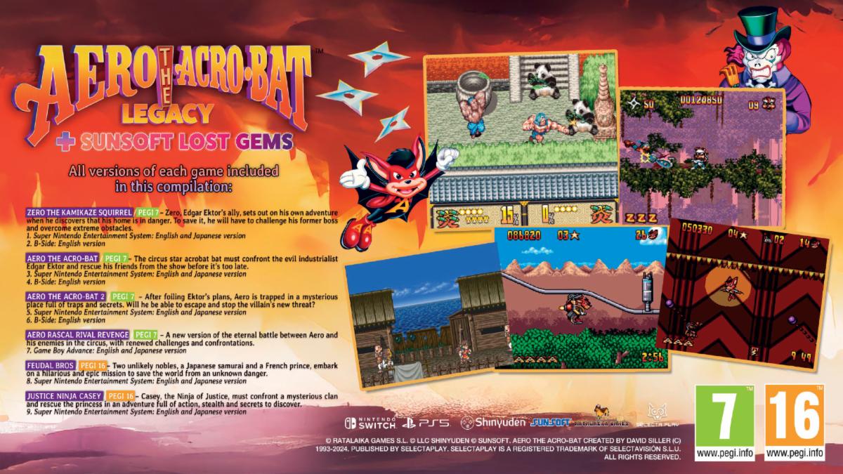 Avis aux amateurs de jeux rétros, Aero the Acro-Bat aura bientôt le droit à sa version physique sur Nintendo Switch et PS5 après une sortie sur l'eShop de la Nintendo Switch. Cette version est le fruit du partenariat entre Selecta Play, Sunsoft, Ratalaika Games, Shinyuden et Maximum Entertainment France. Aero the Acro-Bat Legacy + Sunsoft Lost Gem proposera en réalité une compilation de 6 titres, à savoir :