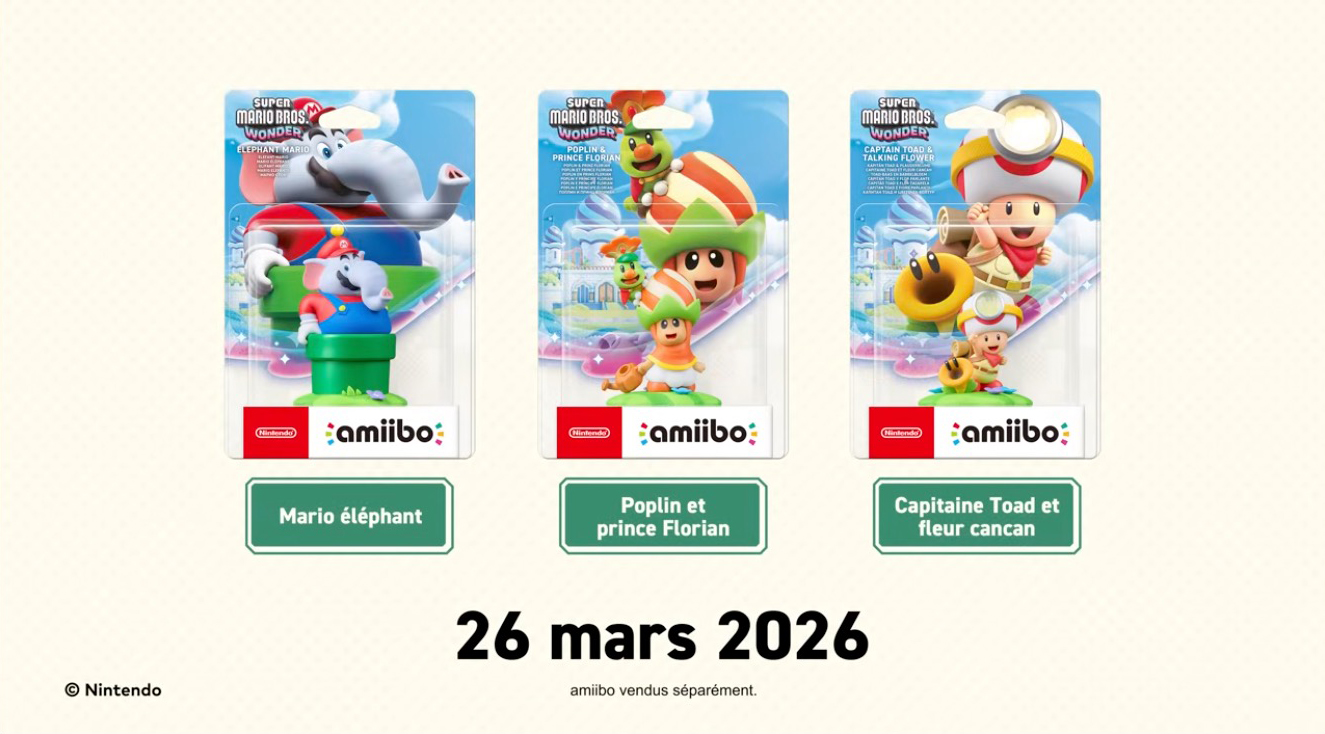 Avec l'annonce de la date de sortie de Super Mario Bros. Wonder – Nintendo Switch 2 Edition + Rendez-vous au parc Bellabel, couplée à l'annonce de la fleur cancan, Nintendo décide de terminer sa journée d'annonce avec une autre petite surprise pour les collectionneurs : une nouvelle gamme d'amiibo Mario Bros. Wonder. Ce sont en tout 3 nouveaux amiibo qui seront proposés dans les étals à partir du 26 mars 2026, soit le même jour que la sortie du jeu :