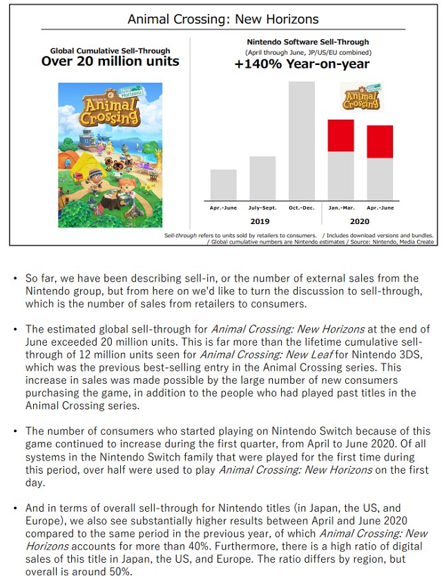 Sorti le 20 mars dernier alors que la France (et une partie du monde) entrait en confinement, Animal Crossing : New Horizons est devenu un véritable phénomène de société en touchant des personnes qui n'y auraient peut-être jamais joué dans d'autres occasions... Un phénomène qui se traduit de différentes façons et en premier lieu dans les chiffres de ventes. On savait déjà que le titre avait quasiment égalé les ventes de son prédécesseur dès sa sortie avec près de 11,77 millions d'exemplaires sachant que Animal Crossing: New Leaf s'est écoulé à 12.55 millions d'exemplaires sur 3DS. Mais suite à la publication du dernier bilan financier de Nintendo (voir ici) on découvre que depuis, Animal Crossing : New Horizons a quasiment doublé ses ventes ! En trois mois à peine, Animal Crossing : New Horizons s'est en effet écoulé à près de 22,40 millions d'exemplaires dans le monde ! Du jamais vu pour un jeu exclusif sachant que sa carrière n'est pas encore finie...