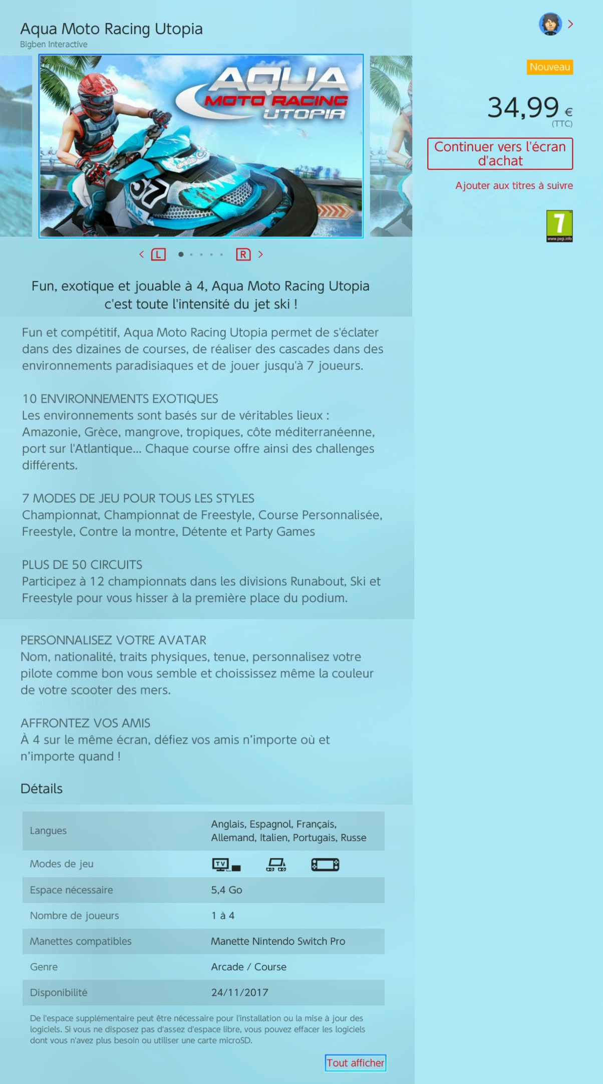 Pour rappel AQUA Moto Racing Utopiaest disponible depuis le 24 novembre au prix de 34,99€. Son poids sur l'eShop est de 5,4 Go