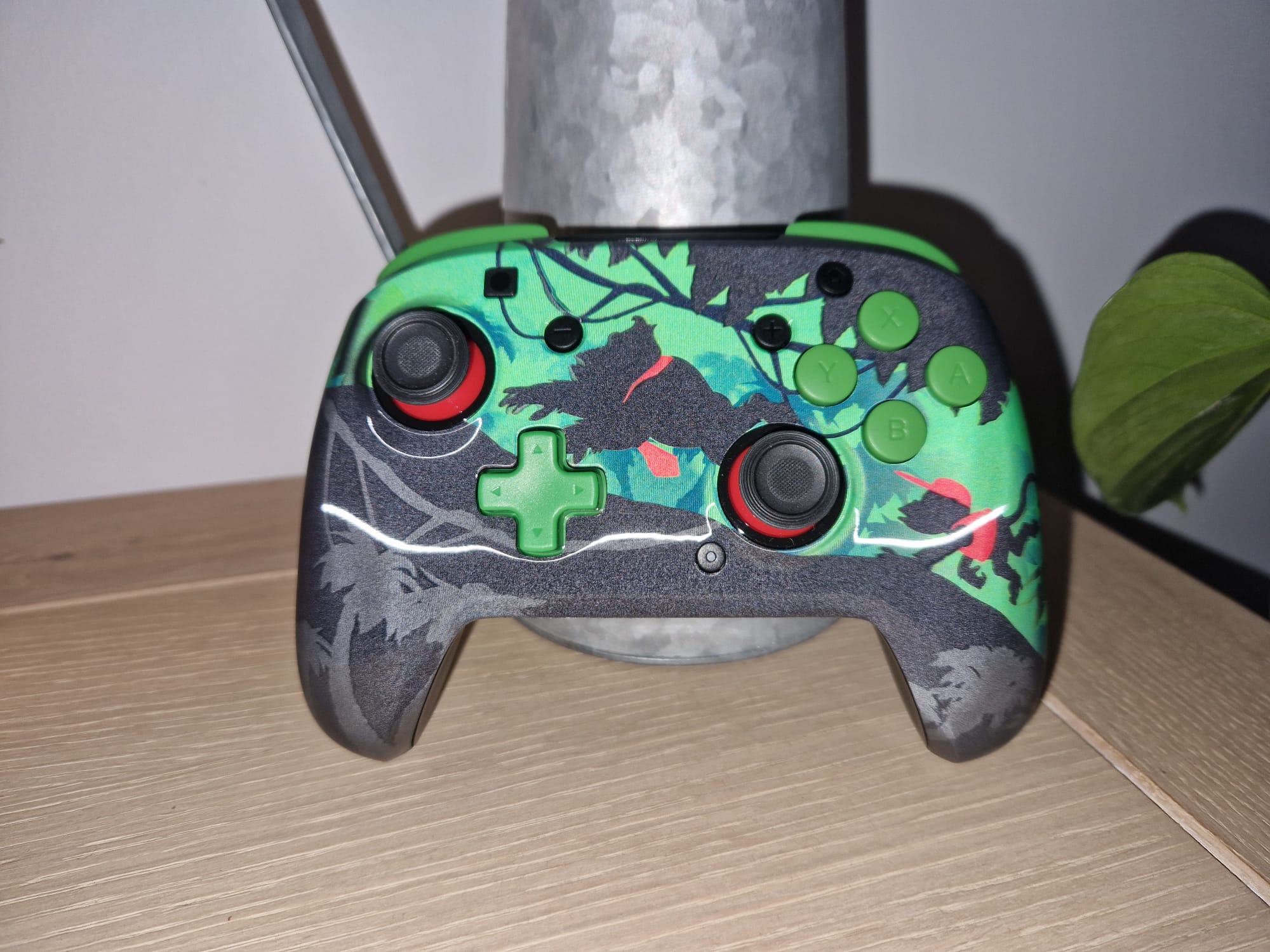Pour celle-ci, vous trouverez la même conception holographique mais bien évidemment avec l'univers de Donkey Kong. D’ailleurs le thème nous rappelle un niveau de Donkey Kong Country Returns, à savoir celui où l’on voit à la fois Donkey et Diddy en ombre laissant apparaître leurs apparats rouges. Ici, la mpanette opte donc pour un noir profond sur lequel est apposé un jungle verdoyante. L’intérieur des sticks est rouge alors que les boutons ainsi que la croix sont verts. L'aspect holographique qui se dévoile sur cette manette n’est autre que la jungle qui apparaît en fond sur la partie verte donnant ainsi plus de relief à l’illustration. C’est en effet très sympa mais l’aspect est quelque peu un poil discret pour émerveiller. Malgré tout, le tout offre un aspect très classe tant par le choix des couleurs que de la finition globale.