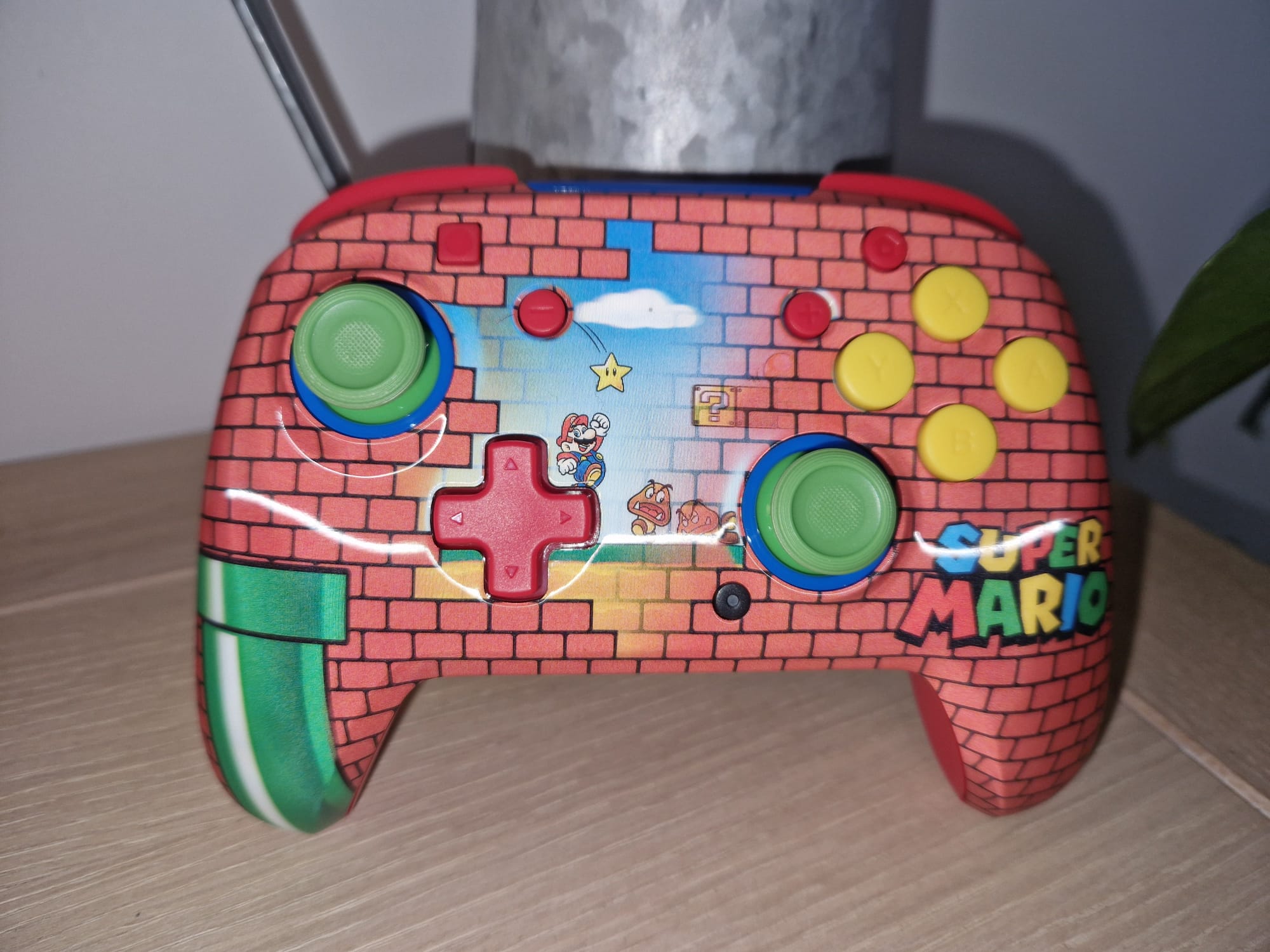 Une des particularités de cette nouvelle manette se situe sur le fait qu’elle a un skin holographique. En effet, bien qu’elle arbore les couleurs iconiques de la série, la manette intègre en son centre une illustration qui apparaît / disparaît en fonction de l'inclinaison de la manette. Ainsi, c’est un dessin représentant un Mario sautant vers une étoile dans un niveau 2D d’antan qui ravira vos yeux de fans tout en mettant en scène aussi deux gouba et un super champi. Le dessin vient s’incruster sur un mur de brique, donnant ainsi un effet très plaisant. Outre l’effet holographique et le mur de brique, le reste de la manette arbore une couleur rouge Mario. De plus, les sticks sont vert tuyau avec un cerclage bleu salopette. Enfin les quatre bouton sont jaunes pièce.