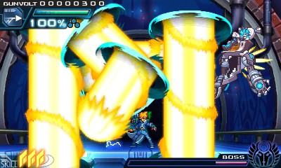 Ce qui nous mène donc à Azure Striker Gunvolt. Toujours dans la lignée de la série Mega Man, Gunvolt devra affronter divers boss, ayant eux aussi des pouvoirs psychiques ayant pour thème le feu ou de la matière noire. Le jeu contiendra quelques éléments de RPG puisqu'au fil des combats, Gunvolt apprendra de nouvelles capacités et sera donc en mesure d'affronter des adversaires plus puissants.