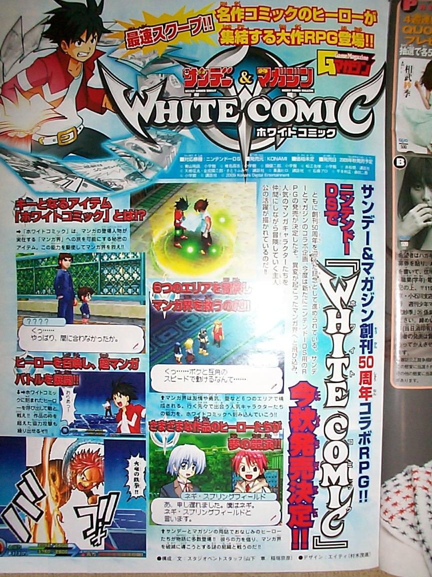 Dans la dernière édition du magazine Shōnen Jump, nous avons pu apercevoir les premières images de la nouvelle licence du studio Konami, baptisée White Comic. Si à l'heure actuelle nous avons encore trop peu d'informations sur ce nouveau titre, nous savons que White Comic sera un mélange action/RPG et disposera d'un système de « combats » à base de cartes.