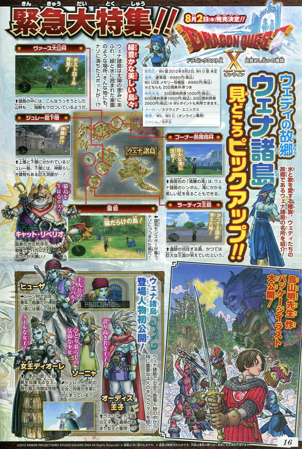 S'il nous tarde de découvrir les premiers médias concernant la version Wii U de Dragon Quest X : Rise of the Five Tribes Online, c'est aujourd'hui un nouveau scan de la version Wii qui nous est fourni. Issu du magazine Jump, celui-ci nous dévoile quelques nouveaux artworks des personnages ainsi que ce qui semble être une carte du monde ou du moins une partie. Nous espérons que l'E3 sera propice à la présentation du titre sur la future console HD de Nintendo et que le jeu sera annoncé pour l'Europe, ce qui ne semble pas gagné d'avance.