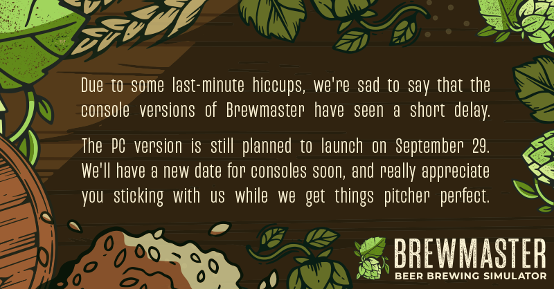 Attendu initialement pour la fin du mois de septembre, il semblerai que Brewmaster, vous faisant incarner un artisan brasseur ait quelques problème niveau fermentation. Les développeurs de chez Auroch Digital ont en effet laissé un message indiquant que le titre avait quelques petits soucis logistiques. Si la version PC reste bien maintenue pour le 29 septembre, les versions console quant à elles sont repoussées à une durée indéterminée. Les brasseurs en herbe le savent, le temps de fermentation c'est important !