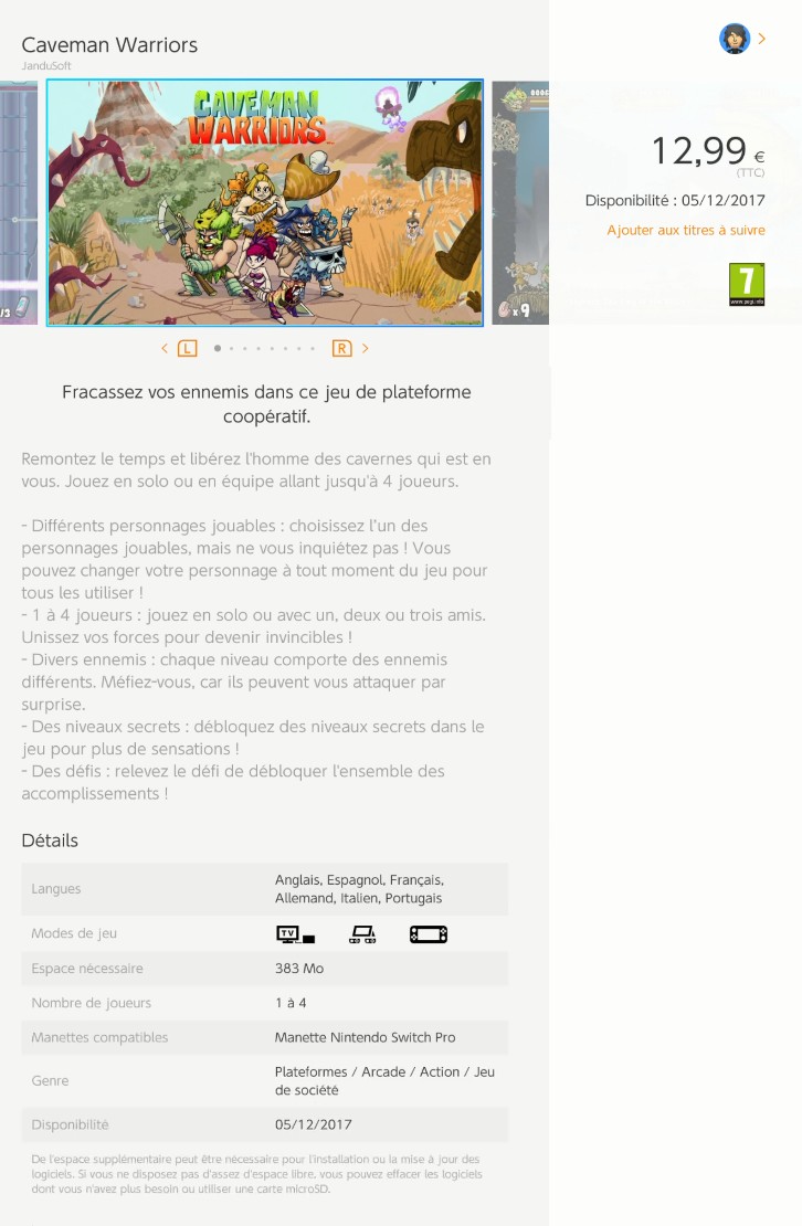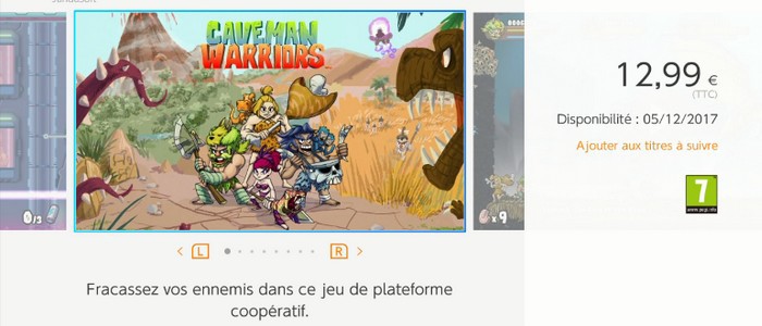 Caveman Warriors est un jeu de plateforme et de baston jouable seul ou à plusieurs jusqu'à quatre vous transportant à l'âge de pierre. Il arrive le 5 décembre 2017 sur l'eShop de la Switch au prix de 12,99€. Son poids est de 383 Mo. Retrouvez ci-dessous la fiche eShop du jeu et son trailer.