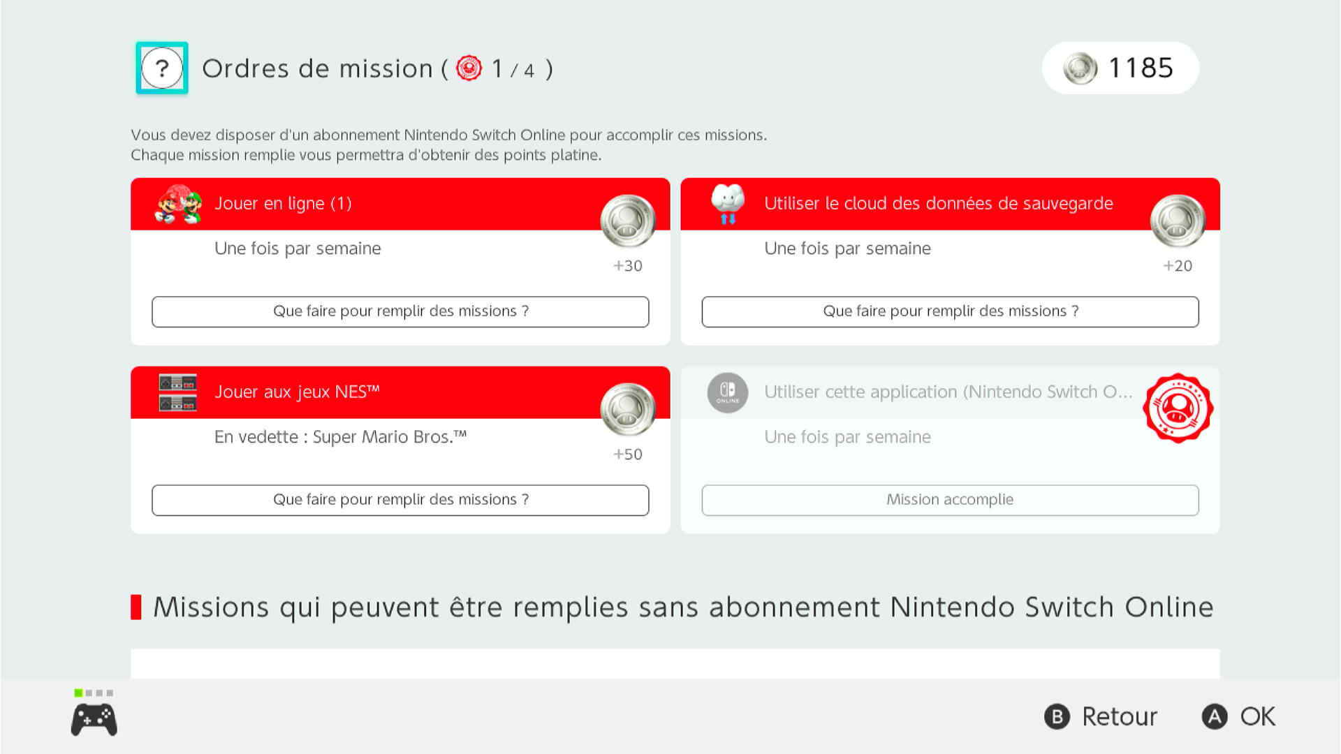 Depuis ce jour, le Nintendo Switch Online accueille une nouvelle option : Missions et Récompenses. Il s'agit d'inciter les joueurs à utiliser les fonctions en ligne de la Nintendo Switch et bien sûr à promotionner le Nintendo Switch Online. Le principe est simple : toutes les semaines des "missions" sont proposées aux abonnées du Nintendo Switch Online permettant de gagner des points Platine. Pour rappel, les points Platine sont des points que l'on obtient très facilement en jouant aux jeux mobiles Nintendo et désormais donc, en remplissant certaines missions.