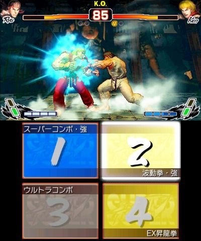 Capcom vient aujourd'hui d'annoncer l'intérêt de l'écran inférieur de la Nintendo 3DS. Ce dernier sera en effet composé de 4 carrés sur lesquels on pourra assigner des combinaisons de touches. Un hadoken de Ryu pourra donc être exécuté d'un quart de cercle suivi d'une des touches de poing, mais aussi en tapotant l'un des quatre carrés présents sur l'écran tactile, ce qui est une option clairement orientée "grand public".