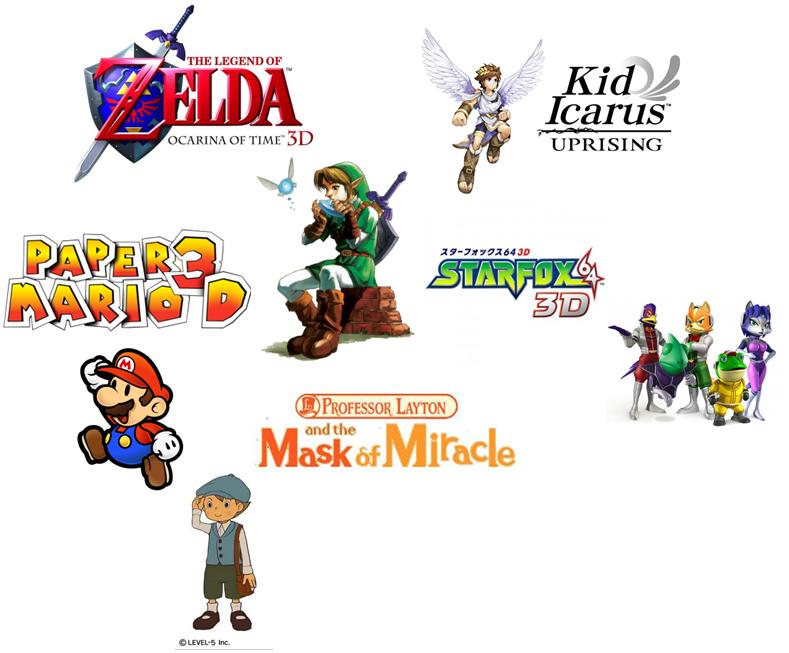 On nous dira que The Legend of Zelda : Ocarina of Time, Kid Icarus : Uprising, Star Fox 64 3D, Paper Mario 3D, Mario Kart 3D, Animal Crossing 3D et Professeur Layton et le Masque des Miracles, tous sortiront bientôt sur 3DS. Certains d'entre eux obtiendront d'ailleurs des dates définitives. On y ajoute ensuite l'annonce de Brain Training 3DS, que nous savons déjà en développement, et The Legend of Zelda : Majora's Mask, probablement en toute logique, pour l'année prochaine. Une ou deux autres surprises ne sont pas à écarter. Allez soyons fous, que pensez-vous d'un Pikmin 3D, Metroid 3D, ou d'une bombe en termes de ventes : New Super Mario Bros. 3D ?