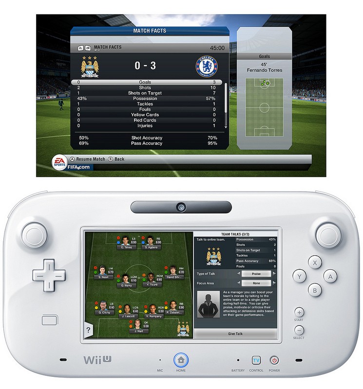 FIFA 13 d'Electronic Arts arrivera aussi sur Wii U, très prochainement, avec le lancement de la console de Nintendo. Le mastodonte des jeux de foot exploite à son tour le gameplay propre à la console next-gen, avec son GamePad. Il nous le présente en images dans ce trailer ci-dessous ainsi que dans les quelques screens plus bas. On accueille donc cette vidéo en attendant de pouvoir chausser les crampons pour se faire une vrai idée du jeu. C'est d'autant plus agréable que l'on n'avait pas encore grand chose à se mettre sous la dent pour la version Wii U.