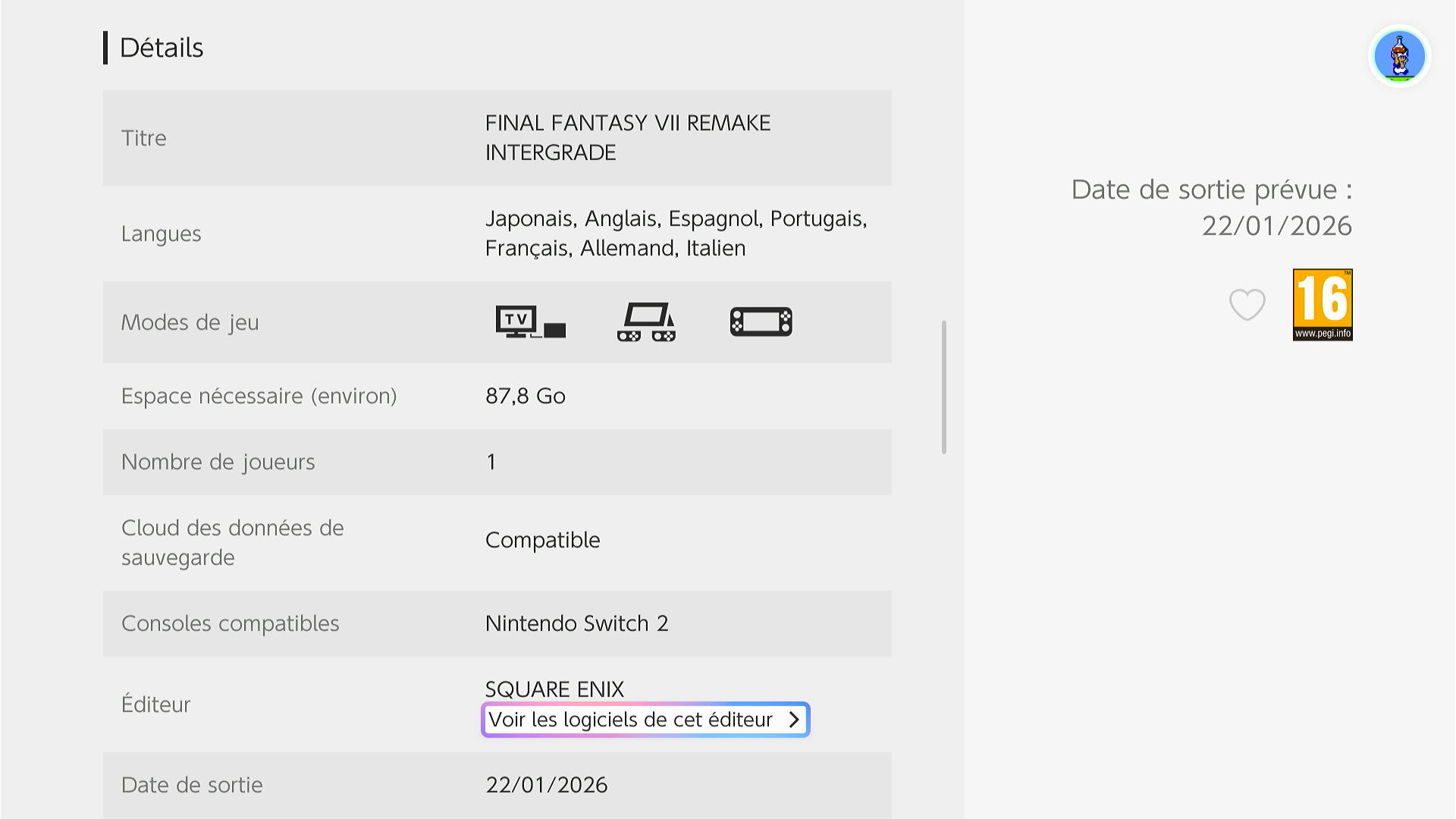 Pour rappel, Final Fantasy VII Remake Intergrade est prévu le 22 janvier 2025 sur Nintendo SWITCH 2