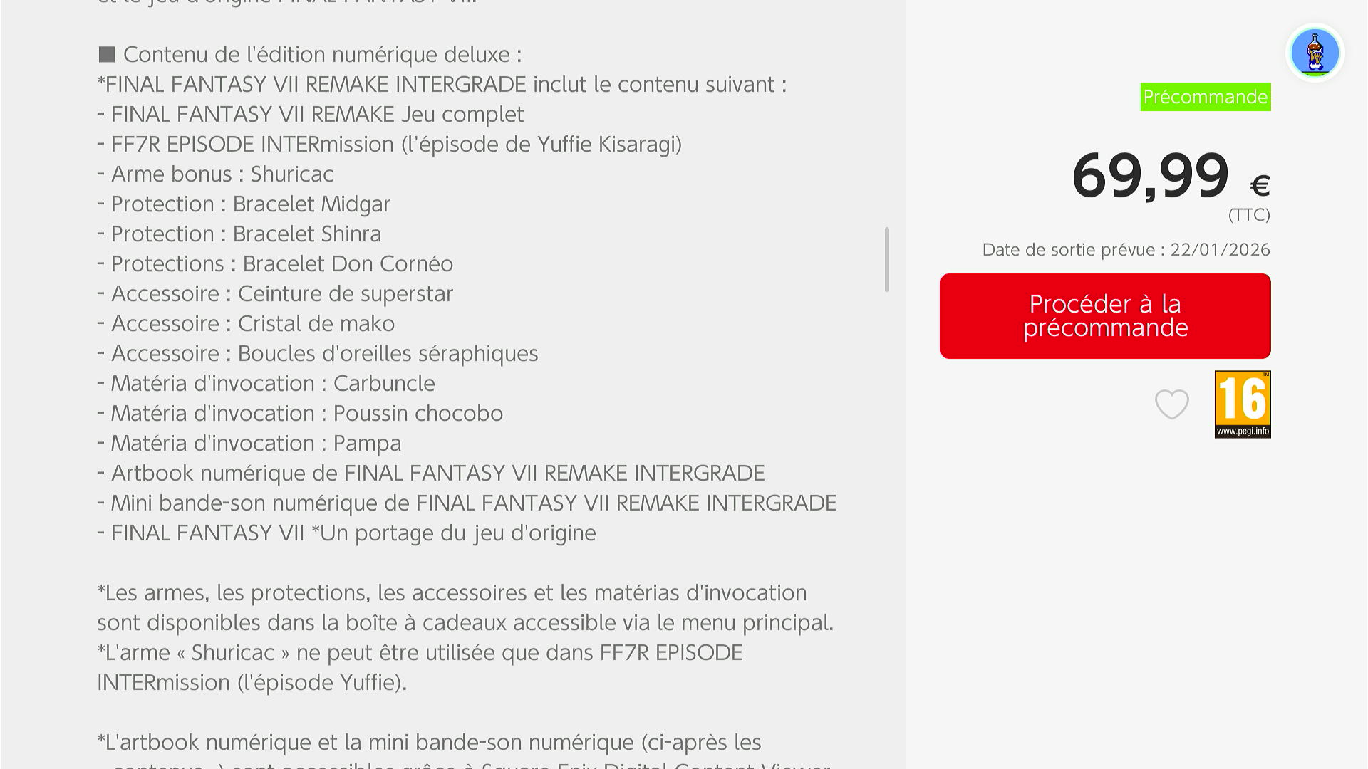 L'édition numérique deluxe de FINAL FANTASY VII REMAKE INTERGRADE contenant ce produit, ainsi qu'un contenu numérique bonus, est également disponible. Veillez à ne pas effectuer d'achats en double.