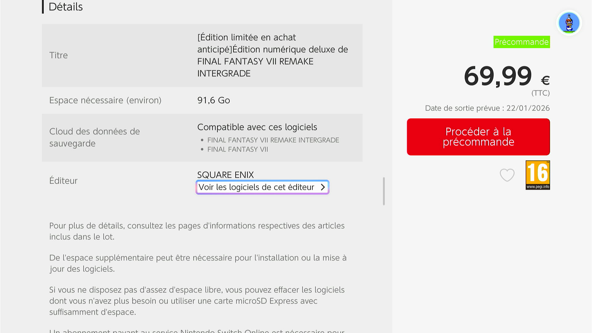 Correction des exigences de stockage pour Final Fantasy VII Remake Intergrade sur Nintendo Switch 2. Édition standard : 90 Go à 95 Go Édition limitée en précommande et éditions numériques de luxe limitées en précommande : 93,8 Go à 99 Go.