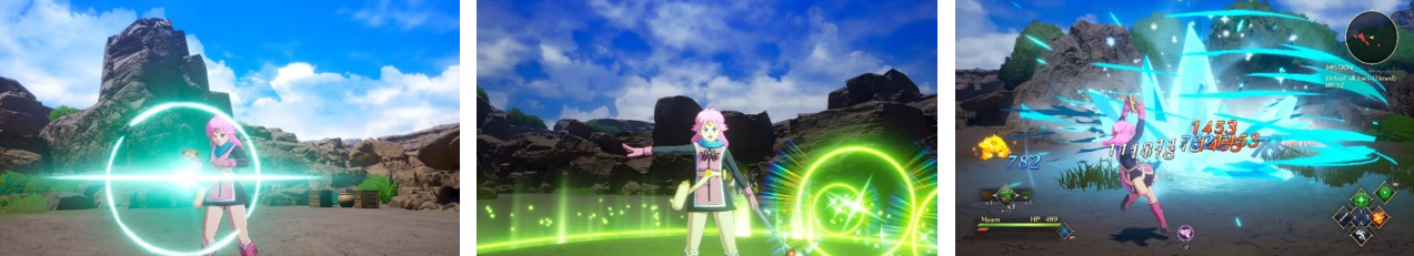 Style de combat de Maam – prêtresse : attaquer à l'aide de sa lance-marteau et soutien des alliés grâce à son pistolet magique.