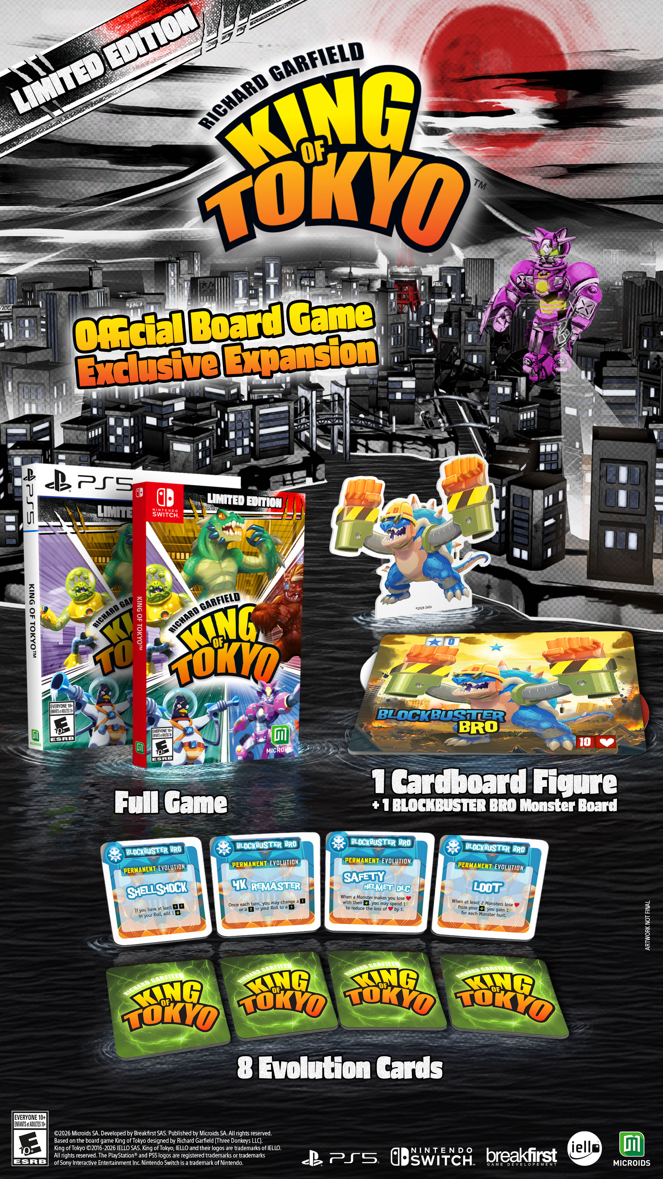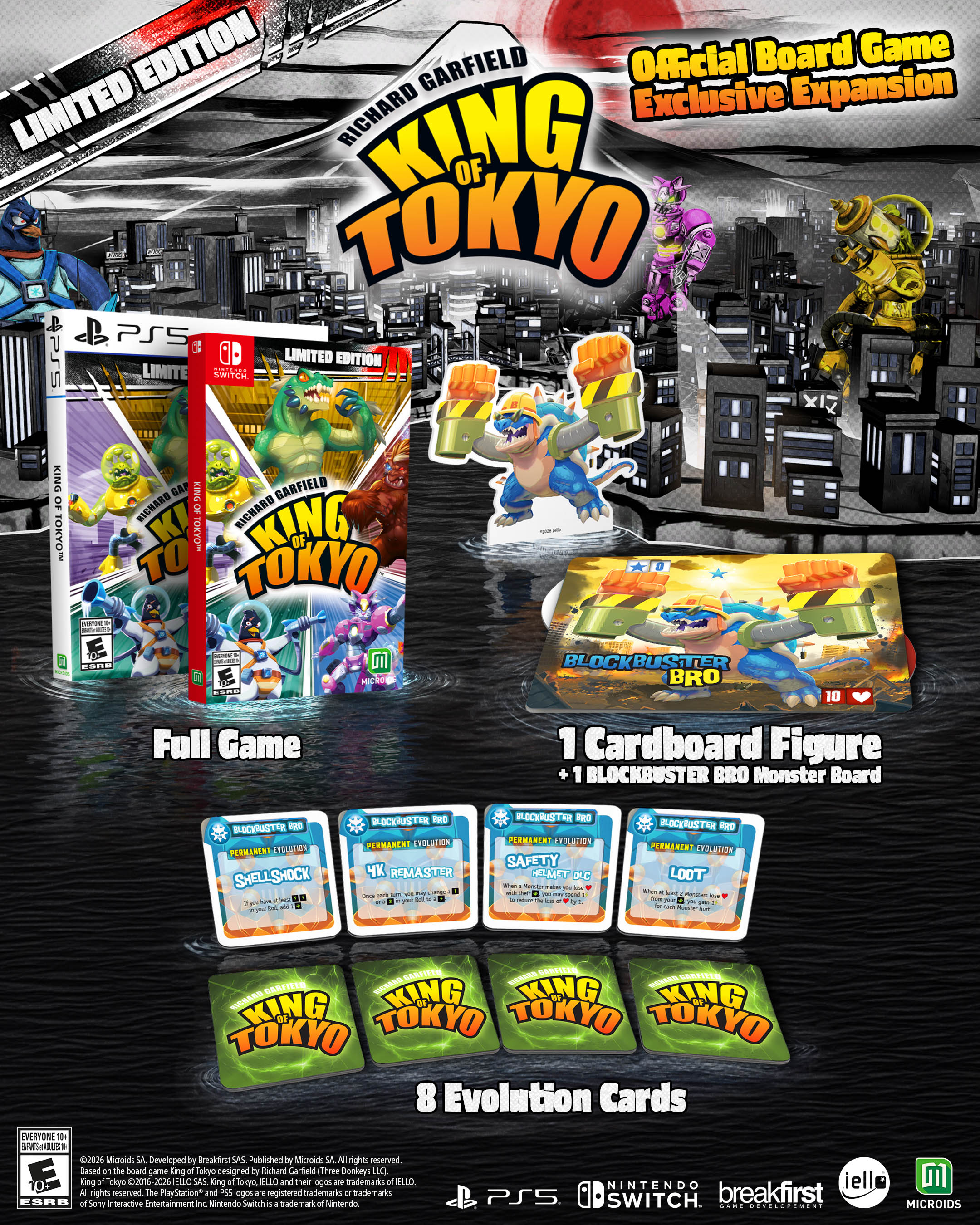 Le légendaire King of Tokyo, le jeu de société culte signé Richard Garfield, créateur du mythique Magic : The Gathering, arrive en jeu vidéo le 21 mai 2026 édité par Microids sur Nintendo Switch et supports concurrents. Le titre aura également le droit à une édition physique classique, ainsi qu'une édition limitée qui contient les éléments suivants :