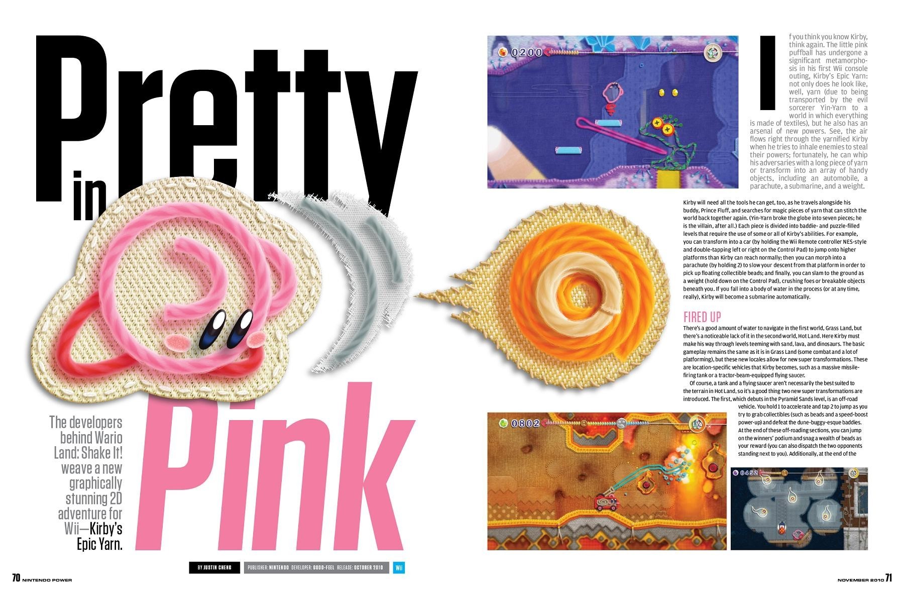 La célèbre boule rose de Masahiro Sakurai refait aujourd'hui brièvement parler d'elle à la page 70 du dernier numéro du Nintendo Power. En effet, le magazine américain nous livre diverses informations concernant l'ambitieux Kirby's Epic Yarn :