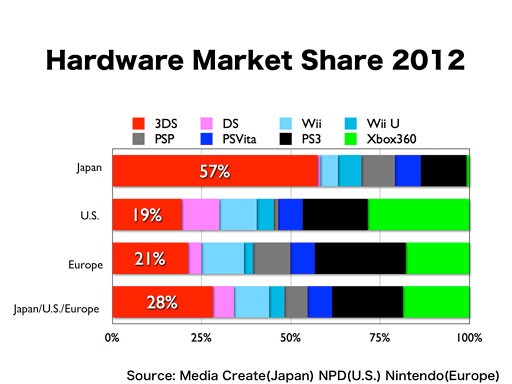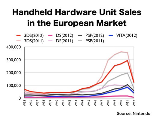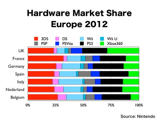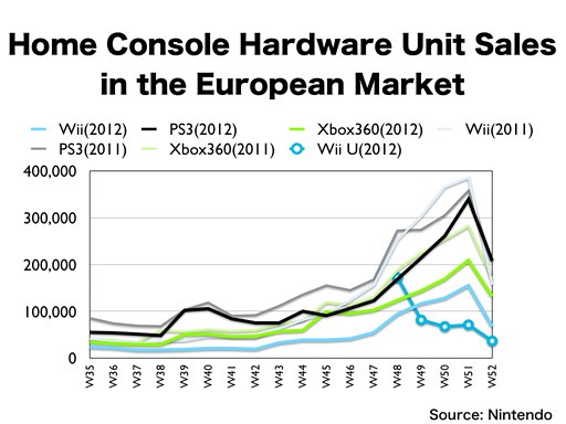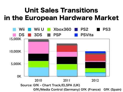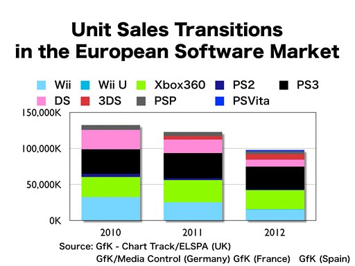 Afin d’être représentatif du marché européen dans sa globalité, Nintendo s’est basé sur ceux du Royaume-Uni, de l’Allemagne, de la France et de l’Espagne. Ainsi, Satoru Iwata, d’après l’analyse des ventes de consoles sur ces trois dernières années en Europe, a signalé en premier que le marché a dans sa globalité diminué de 24% en 2012. Sur le marché du software, le constat final est identique : un déclin général du nombre de ventes des jeux est observé.