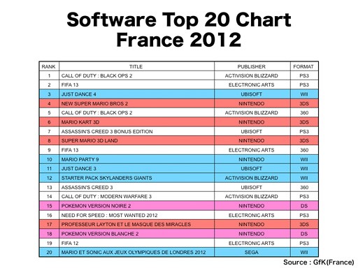 Mais soyons un peu chauvins et concentrons-nous sur la France. C’est dans notre cher pays (et en Allemagne) que les ventes de Nintendo 3DS sont les plus satisfaisantes et c’est même la seule console qui enregistre une progression de ses ventes. D’ailleurs, dans le Top 20 des ventes annuelles de jeux en France, nous retrouvons onze titres destinés aux plates-formes Nintendo avec certains gros titres de la 3DS dans les plus hautes places. Notons également l’encore grande présence de la Wii.