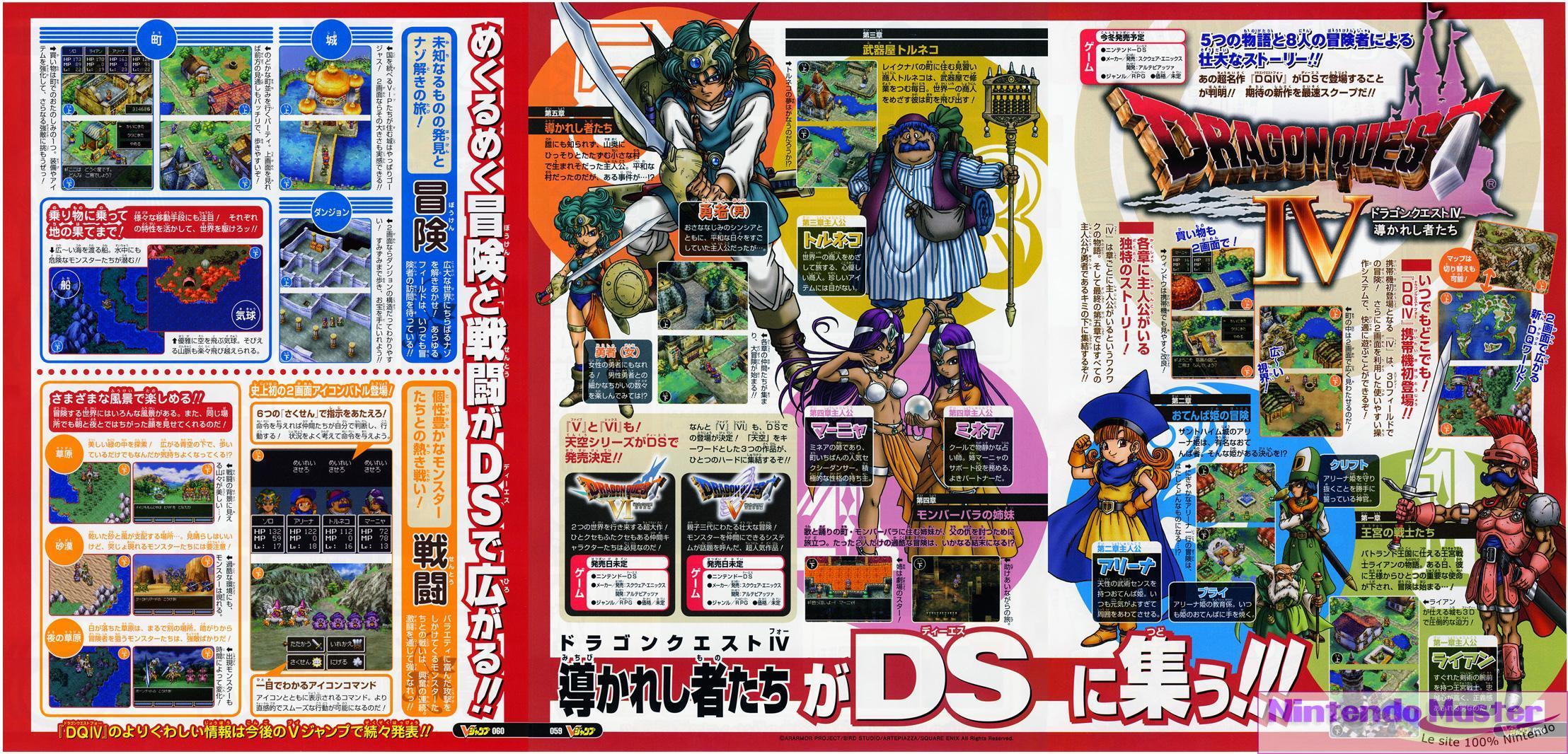 C'est par l'intermédiaire de la dernière édition du magazine Nippon V-Jump que nous pouvons découvrir de nouvelles images de Dragon Quest IV, V, et VI, tous les trois prévus sur Nintendo DS et remis à neuf de manière à bien intégrer ce que propose notre console double écran :)