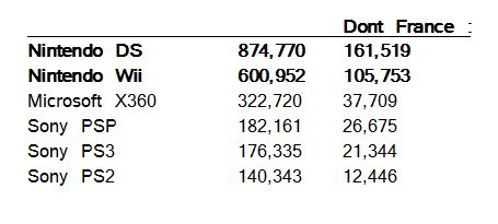 En les ventes de consoles. Avec des chiffres qui ne cessent d'accroitre de semaine en semaine. La DS approche les 900,000 ventes pour la semaine en Europe. La Wii est a 60,0000 exemplaires, ce qui reste deux fois plus que la X360.