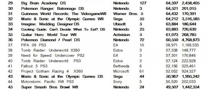 On retrouve un Mario Kart Wii a presque 300,000 ventes, suivi de Wii Fit juste derrière. Pour le reste, jugez plutôt :
