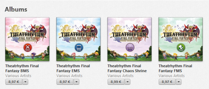 Square Enix a décidé de proposer sur iTunes un petit florilège d'albums composés des mélodies de la bande-son du jeu musical Theatrhythm: Final Fantasy sur 3DS. Celui-ci reprend, sur la base d'un gameplay rythmique, les chefs-d'oeuvres musicaux de Nobuo Uematsu du premier au treizième épisode de la série mythique. Ces albums sont disponibles à l'achat aux alentours de 9 euros chacun et chaque morceau peut être acheté individuellement à 0.69 euros. Ainsi, les personnes ne possédant pas le jeu pourront tout de même profiter des compositions majestueuses de la série emblématique de la société Square Enix et contribuer, par la même occasion, à aider l'entreprise dans cette période de crise économique et financière difficile.