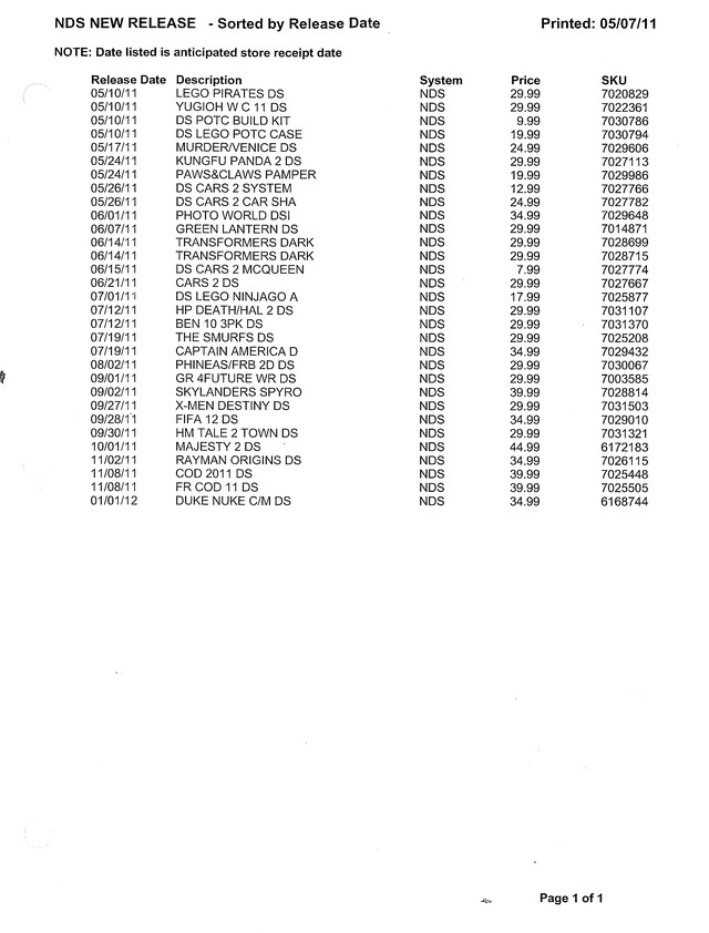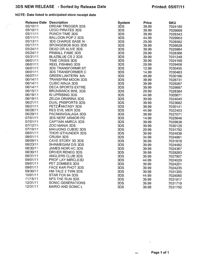Tout d'abord, le fameux revendeur américain semble confirmer Rayman Origins pour la Wii et la 3DS, ainsi que... la DS ?! Bizarrement, d'autres sites et magazines préfèrent dire que ce jeu ne sortira que sur PlayStation 3 et Xbox 360... La vérité sera révélée le 12 mai 2011, avec le nouveau Jeux Vidéo Magazine. Ensuite, nous avons Sonic Generations qui pourrait sortir sur 3DS, un Time Crisis pour la machine portable 3D de Nintendo...