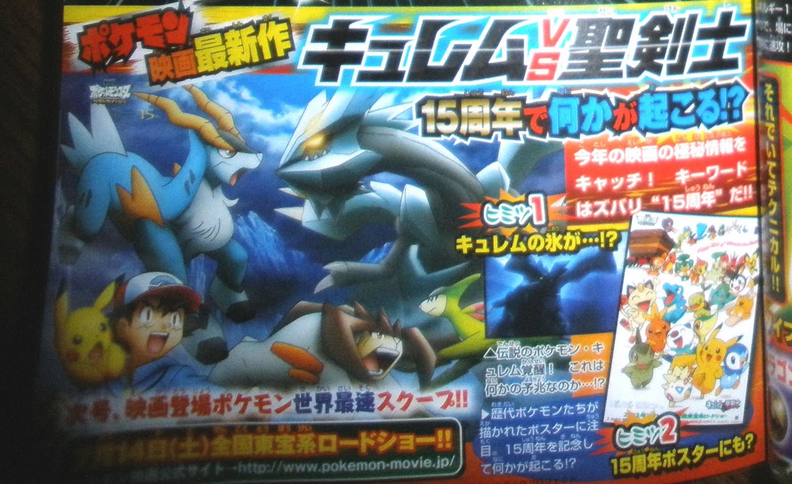 Après la révélation de Pokémon + Nobunaga's Ambition dans l'avant dernier numéro du magazine japonais Coro Coro qui ne faisait que rappeler ce que nous savions déjà, la nouvelle édition qui vient de paraître comprend un tease inédit avec un énorme scoop qui sera apparemment révélé dans leur prochain numéro de février et qui sera très excitant pour tous les fans de la série. Un nouveau Pokémon sera en effet révélé (pas un jeu, un Pokémon). Ce nouveau Pokémon apparaîtra dans le quinzième film Pokémon, Kyurem vs. the Sacred Swordsmen qui mettra en principale vedette le grand Kyurem. Dans les autres scans des anciens numéros du magazine, nous apercevions sur les multiples teases les trois mousquetaires (Cobaltium, Terrakium et Virridium) qui auraient un lien avec Kyurem puisqu'ils envoient des rayons lumineux sur son corps. Dans le dernier tease, de nouveaux textes font leurs apparitions.