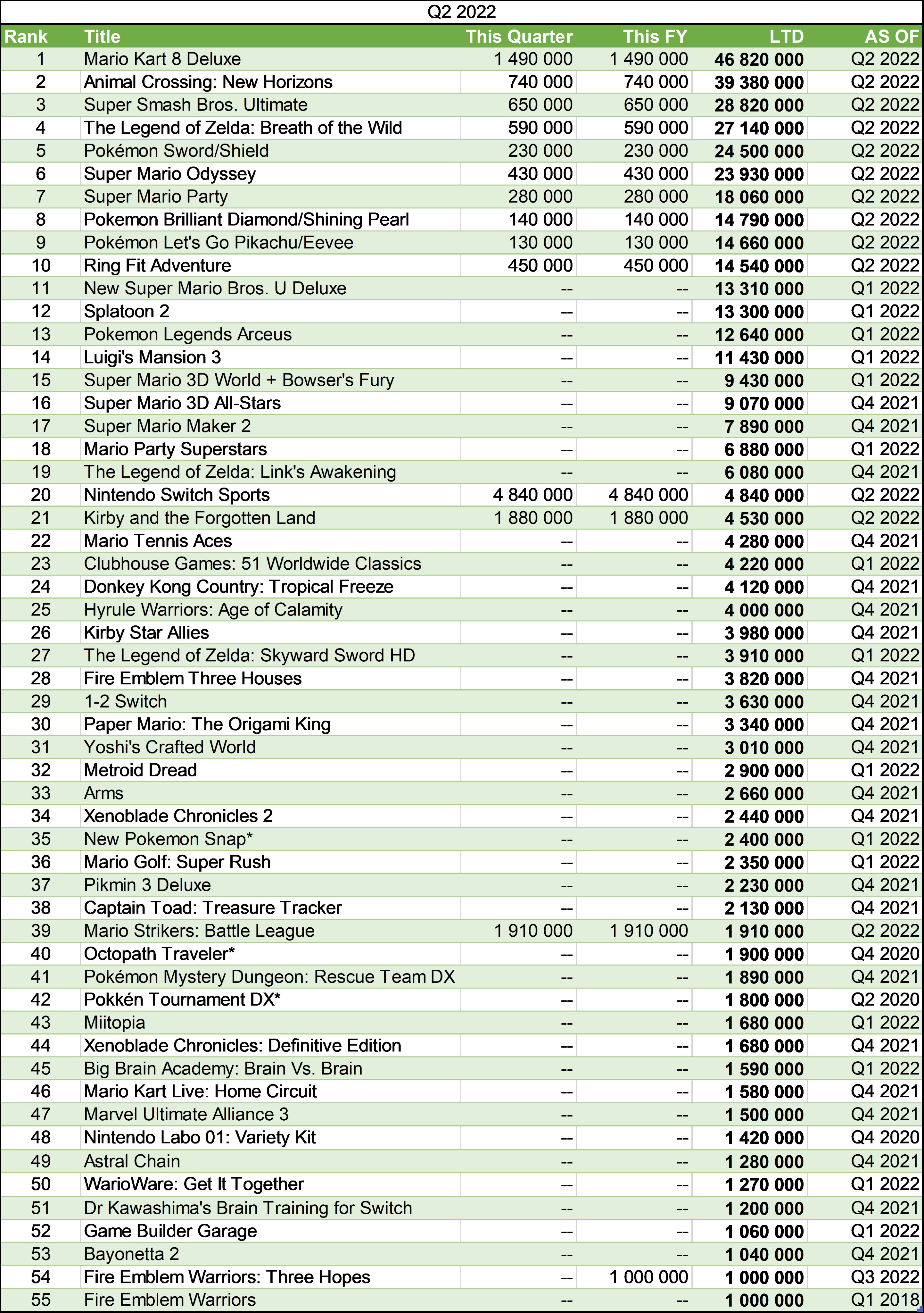 Liste des 55 jeux Nintendo Switch vendus à plus d'un million d'exemplaires dans le monde