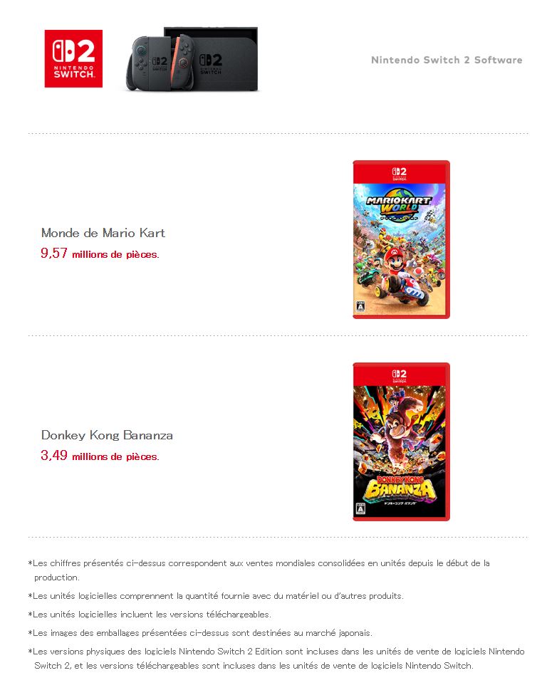 Ainsi pratiquement, tous les possesseurs de Nintendo Switch 2 possèdent Mario Kart WORLD ! Notez que ces chiffres incluent les ventes des jeux en bundle avec la console ainsi que les ventes numériques.