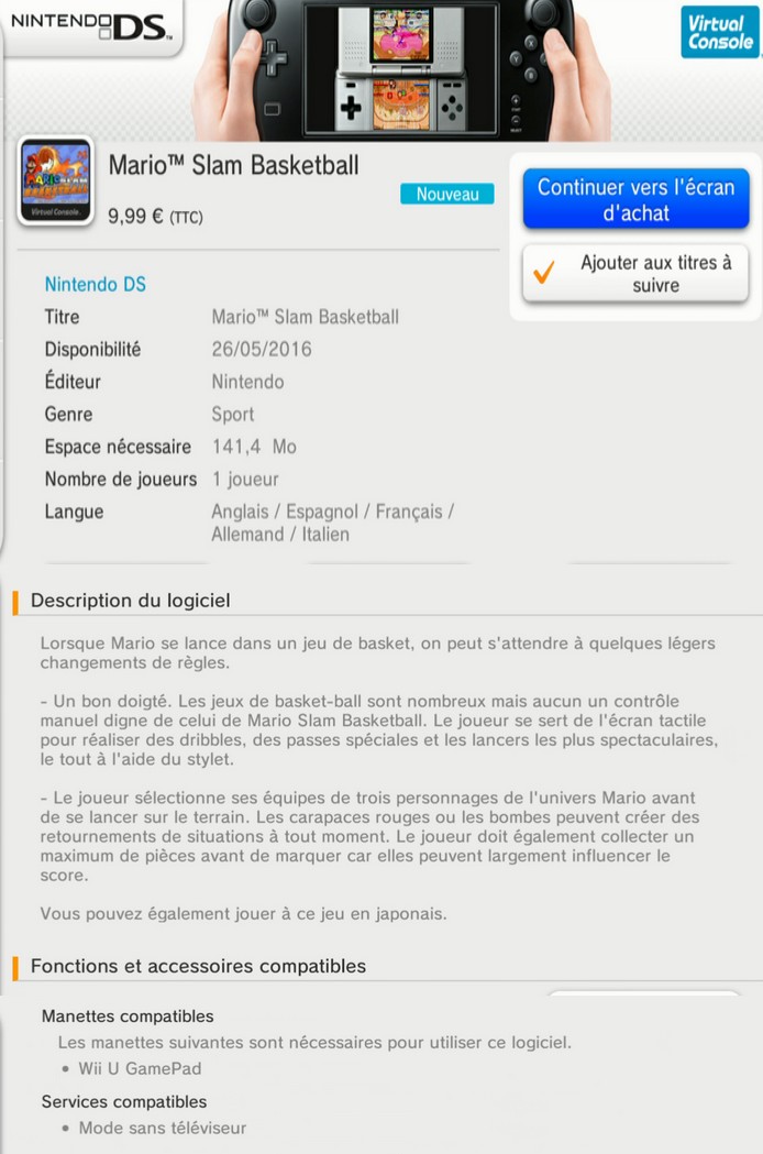 Comme prévu, Mario Slam Basketball le jeu de basket délirant à 3 contre 3 développé par Square Enix est disponible sur l'eShop européen de la Wii U. Si vous souhaitez le télécharger, sachez qu'il vous faudra 141,4 Mo d'espace disponible et qu'il vous coûtera 9,99€. Pour les autres informations veuillez vous référer à la fiche eShop ci-dessous. En prime, retrouvez le trailer et quelques images du jeu.