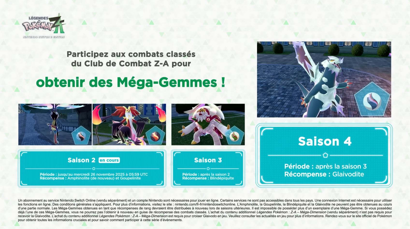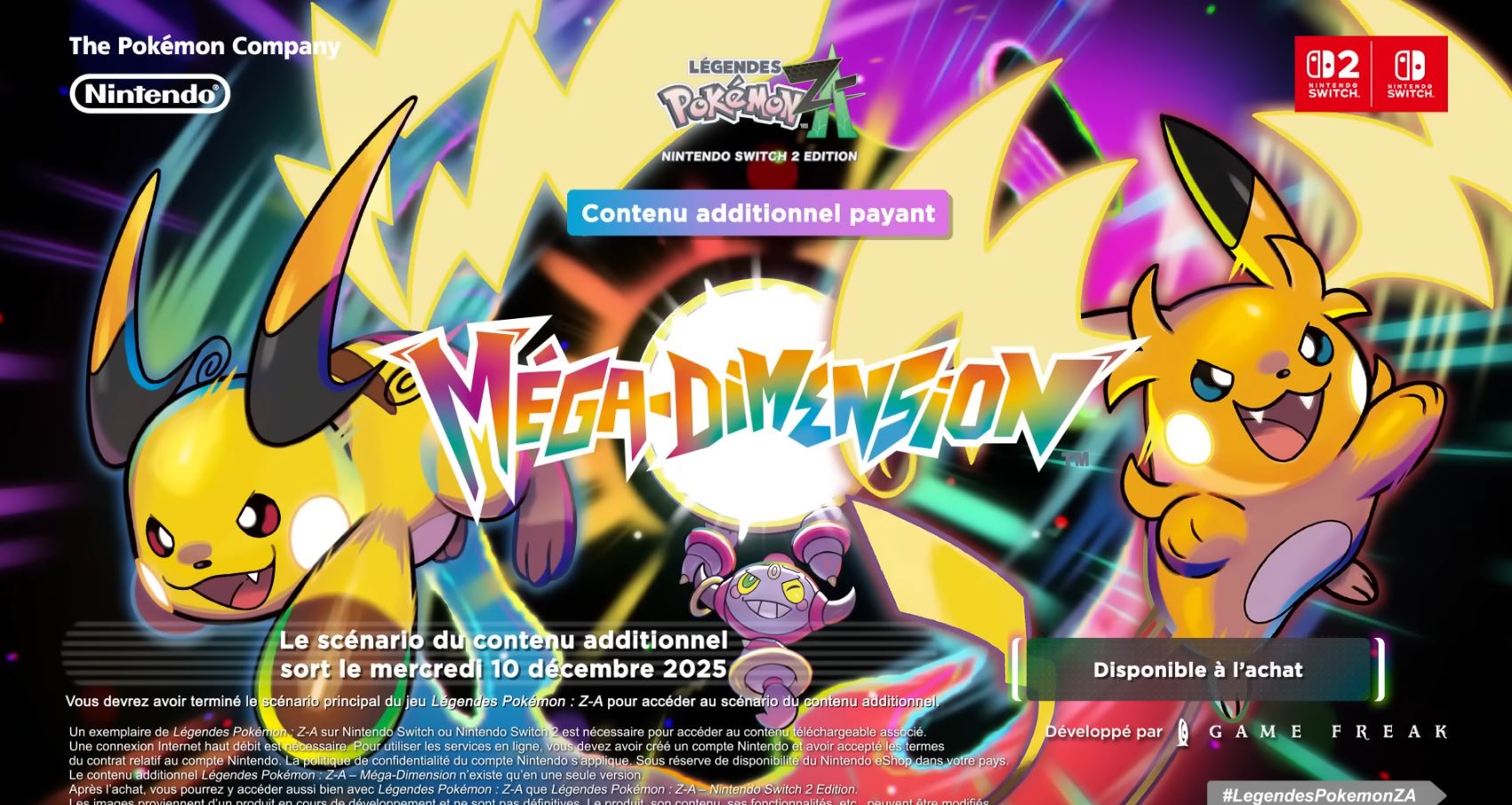 Légendes Pokémon : Z-A est sorti le mois dernier sur Nintendo Switch et Nintendo Switch 2 mais, déjà, le mois prochain, vous pourrez découvrir une toute nouvelle histoire dans le DLC payant Méga-Dimension sera disponible en téléchargement payant dès le mois prochain ! Vous pourrez aussi y découvrir Méga-Zeraora, un Pokémon méga-évolué dont vous pouvez dès à présent avoir un aperçu sur cette page.