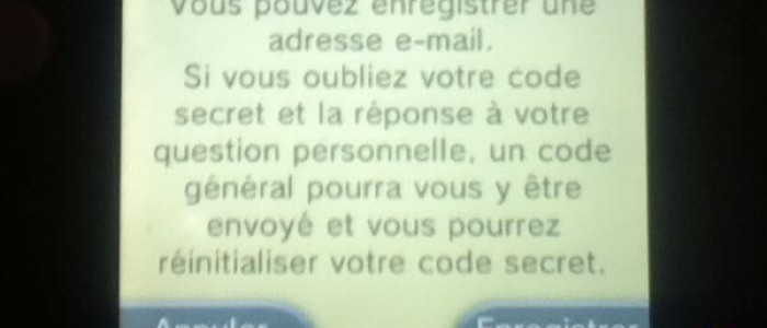 Comme cela arrive régulièrement, la 3DS vient de recevoir une mise à jour. Outre le fait qu'elle améliore comme d'habitude la sempiternelle "stabilité du système", elle ajoute surtout la possibilité d'enregistrer son adresse mail dans le contrôle parental. Ainsi, désormais, si on oublie son code secret ET la réponse à la question de sécurité, il est désormais possible de récupérer un nouveau code par mail.