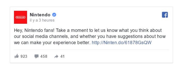 Sur sa page Facebook US, Nintendo vient de lancer une enquête au sujet des réseaux sociaux mais aussi au sujet de la Nintendo Switch. Parmi les questions : avez vous déjà entendu parler de la Switch ? Comptez vous l'acheter ? Quelles fonctionnalités vous plaisent ou vous déplaisent ? Si vous voulez participer à l'enquête (en anglais) ou que vous avez un message à transmettre à Nintendo au sujet de la switch, c'est par ici que ça se passe.