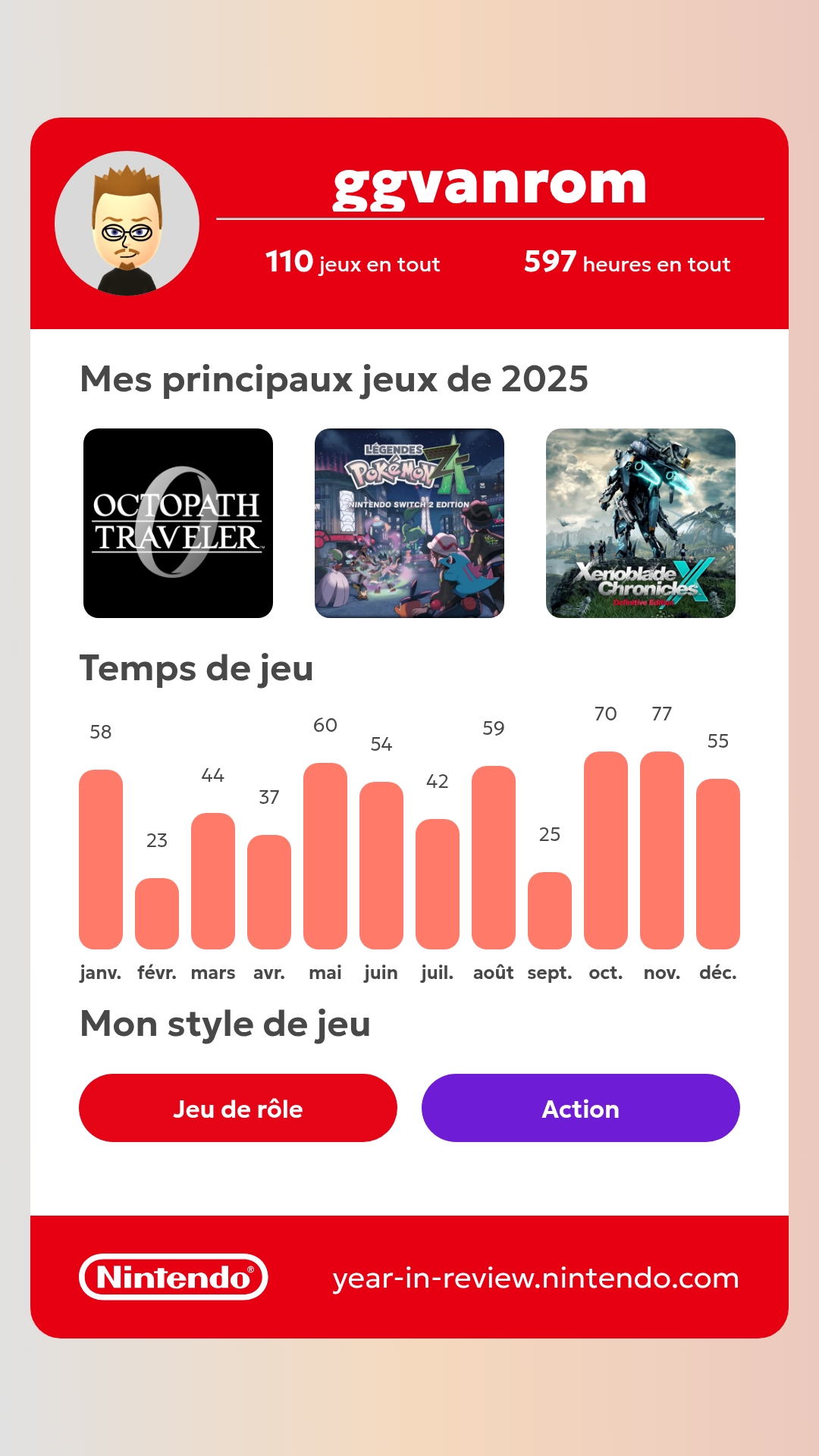 La classique rétrospective annuelle de Nintendo est disponible, l'heure de faire le point sur votre activité sur Nintendo Switch (et Nintendo Switch 2) sur cette année 2025. Combien d'univers avez-vous parcouru ? Quel a été votre genre de prédilection cette année ? Et avez-vous sélectionné votre jeu de l'année ? La réponse a vos questions se trouve juste-ici. N'hésitez pas d'ailleurs à partager vos chiffres en commentaire. Du côté de votre serviteur, cela aura une année baignée par les jeux de rôle (encore). Espérons que cette année 2026 soit elle-aussi chargée en bonnes surprises vidéoludiques et en bons moments passés seul, entre amis ou en famille devant nos consoles hybrides.