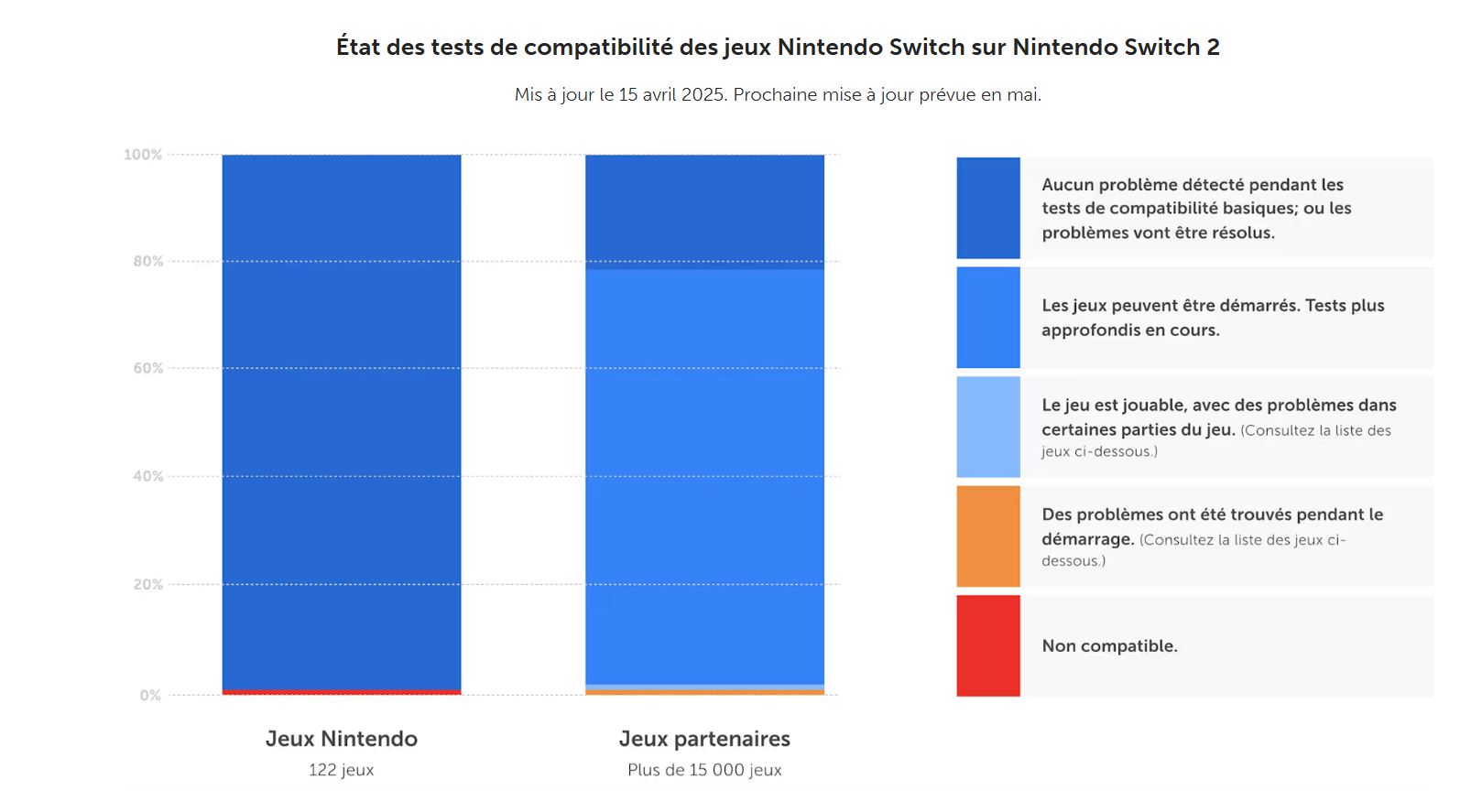 Nintendo a mis en ligne une page qui fait "état des tests de compatibilité des jeux Nintendo Switch sur Nintendo SWITCH 2" ce qui permet de voir qu'en grande majorité, tous les jeux Switch fonctionnent sur la nouvelle console, même si des problèmes persistent sur certains, en particulier sur les jeux tiers.
