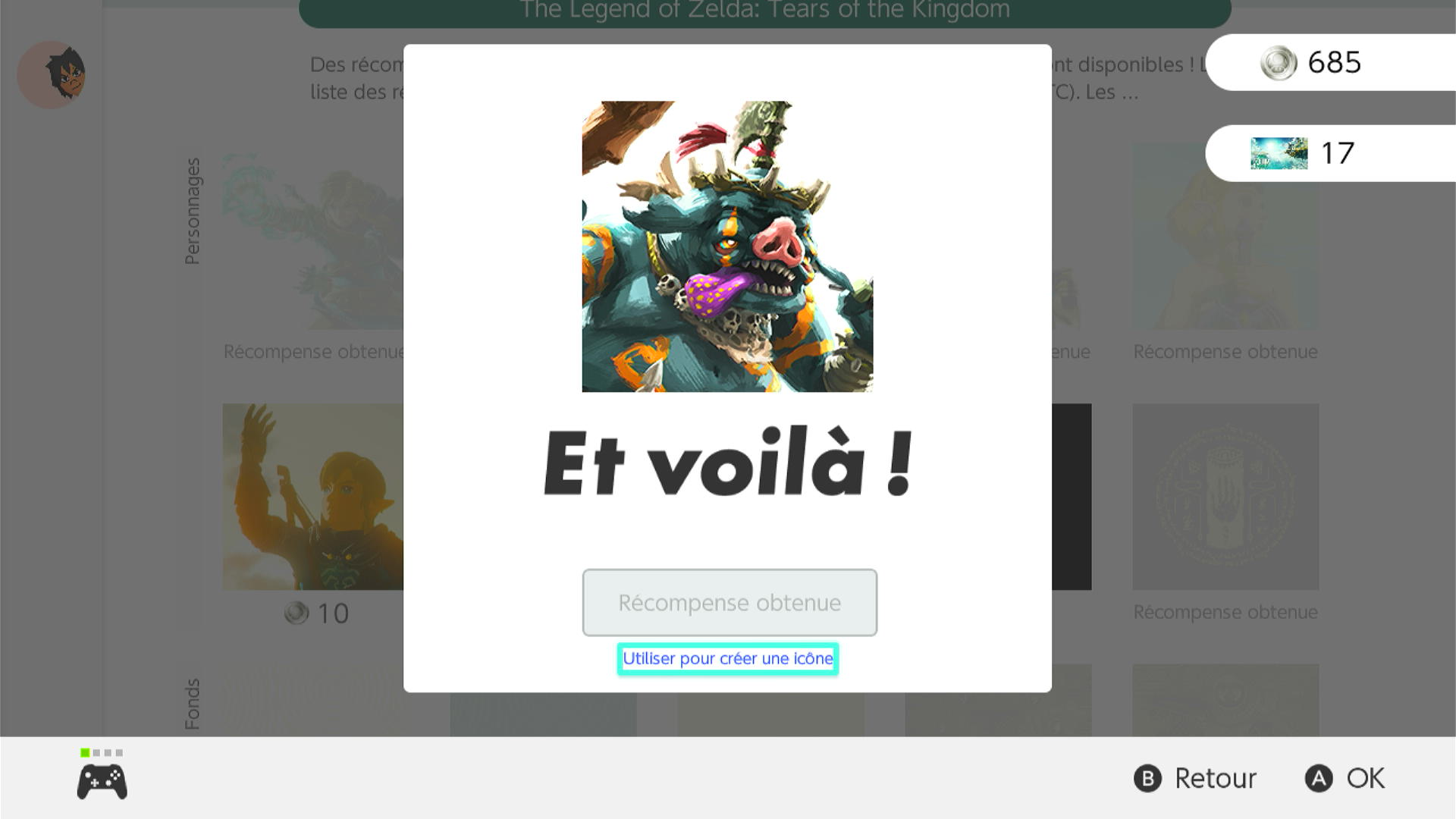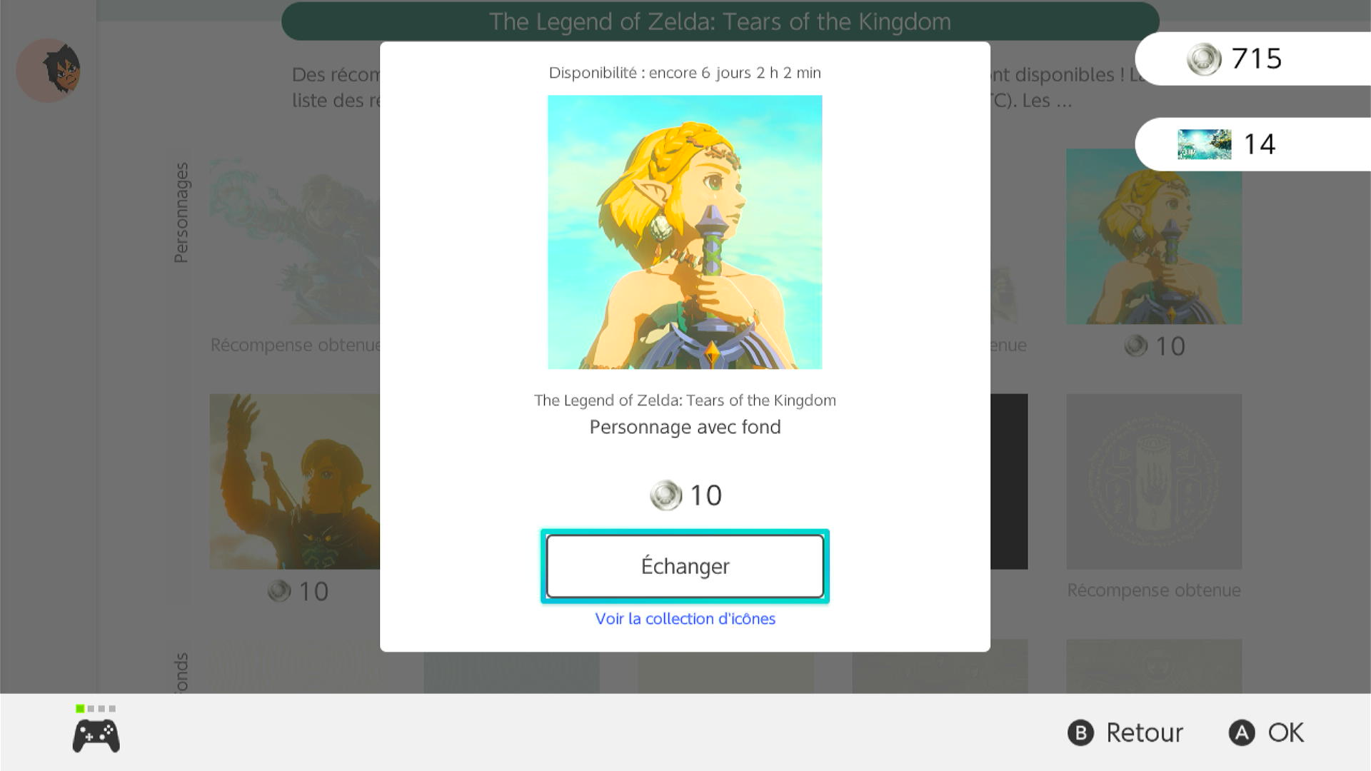 Les abonnés au Nintendo Switch Online peuvent se mettre aux couleurs de The Legend of Zelda : Tears of The Kingdom grâce à la première vague d'icônes dédiées au jeu disponibles depuis hier. En mélangeant des images, des fonds et des cadres, chaque joueur peut ainsi créer son icône personnalisée pour mettre son profil à la mode du moment. Comme d'habitude, les différents éléments vous coûteront entre 5 et 10 points Platine (des points que l'on obtient simplement en jouant ou en se rendant sur les sites de Nintendo). Vous avez une semaine pour faire votre choix sachant que vendredi prochain, la deuxième vague d'icônes viendra remplacer la première. Pour voir les icônes en images, retrouvez nos captures d'écran sur cette page.