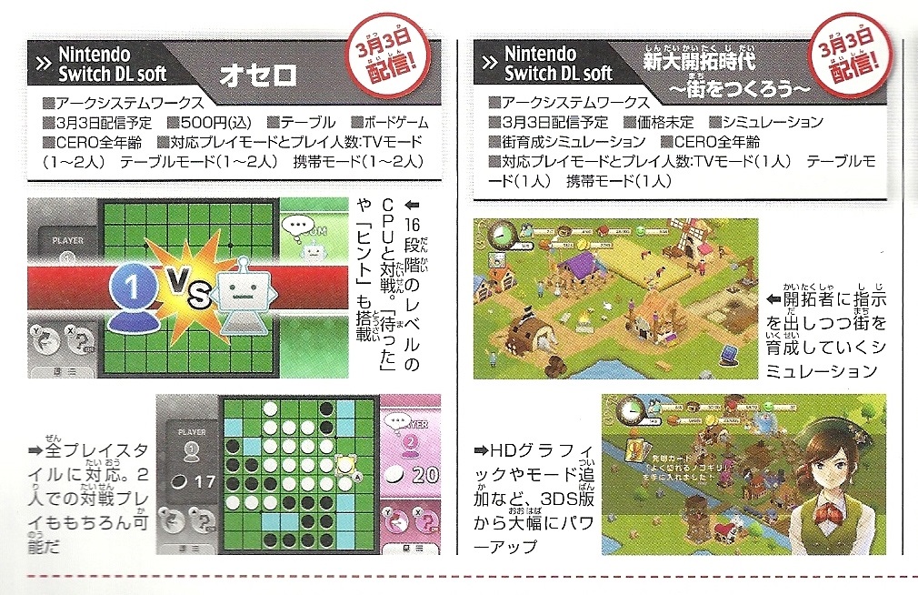 Le jour du lancement de l'eShop de la Nintendo Switch, le 3 mars prochain, le studio Arc System Works a prévu de proposer deux jeux du côté du Japon, à savoir Othello et New Frontier Days : Founding Pioneers. Grâce à la dernière édition du magazine nippon Nintendo Dream de cette semaine, nous pouvons aujourd'hui jeter un premier coup d'œil sur ces deux titres. Voir le scan à la fin de la news.