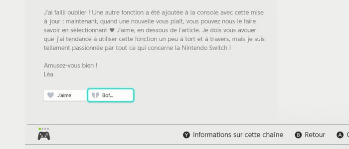 Avec la mise à jour de la Nintendo Switch (voir ici) de nouvelles fonctionnalités ont été ajoutées à la console. Rien d'exceptionnel mais des petits changements plus ou moins intéressants. Ainsi désormais, il est possible de suivre une chaîne consacrée à un titre précis afin de ne louper aucune news le concernant et désormais chaque news peut-être validée par un "j'aime" ou un "Bof". Pour le moment on ne sait pas trop à quoi cela sert si ce n'est, probablement à Nintendo de collecter des informations pour savoir quel jeu plait et quel autre déplaît... Une vidéo ci-dessous vous montre cette fonction sur la console.