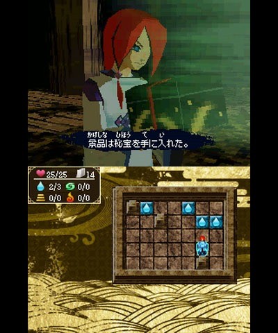 Le fonctionnement du jeu en lui-même est assez classique: on explore un donjon (en 3D assez dégueu d'ailleurs), on tape des méchants dans des duels de cartes à la Yu-Gi-Oh!, et on trouve des trésors secrets - MAIS! des trésors de type carapace de Mario Kart, tonneau DK ou lait Lon Lon, tout de même. Voilà,... bon, en gros, c'était juste pour vous dire que le jeu existe, quoi.