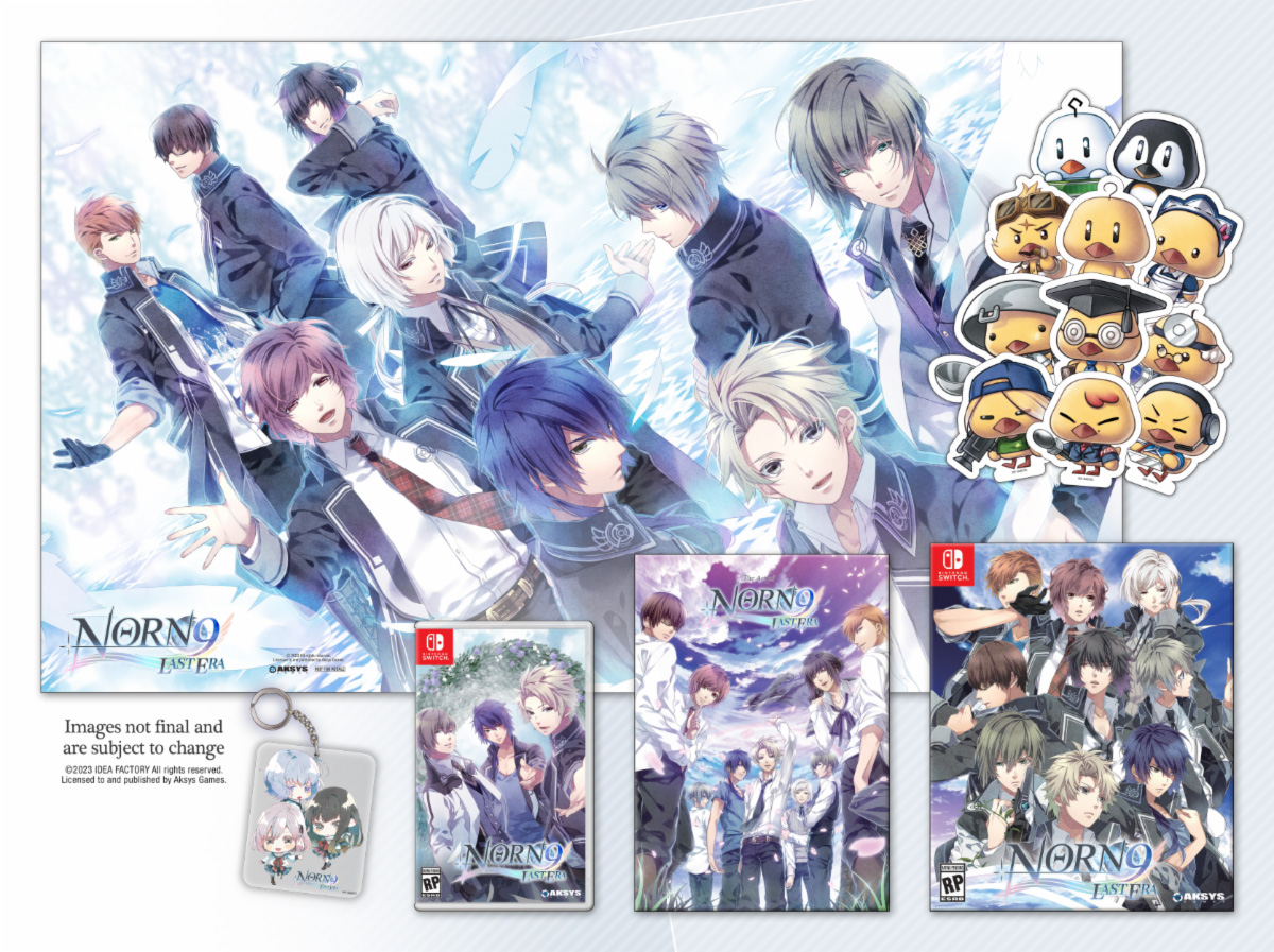 Aksys a également révélé les composants de la prochaine édition limitée de Norn9 : Last Era, localisé pour la première fois en Occident et qui sortira cet été. La collection comprend un Artbook couleur, un poster en tissu de 25" x 15", un ensemble de 11 autocollants en vinyle représentant Hiyoko et un porte-clés en acrylique représentant un dessin chibi. Les premiers exemplaires de Last Era seront également accompagnés d'un jeu de douze cartes de personnage.