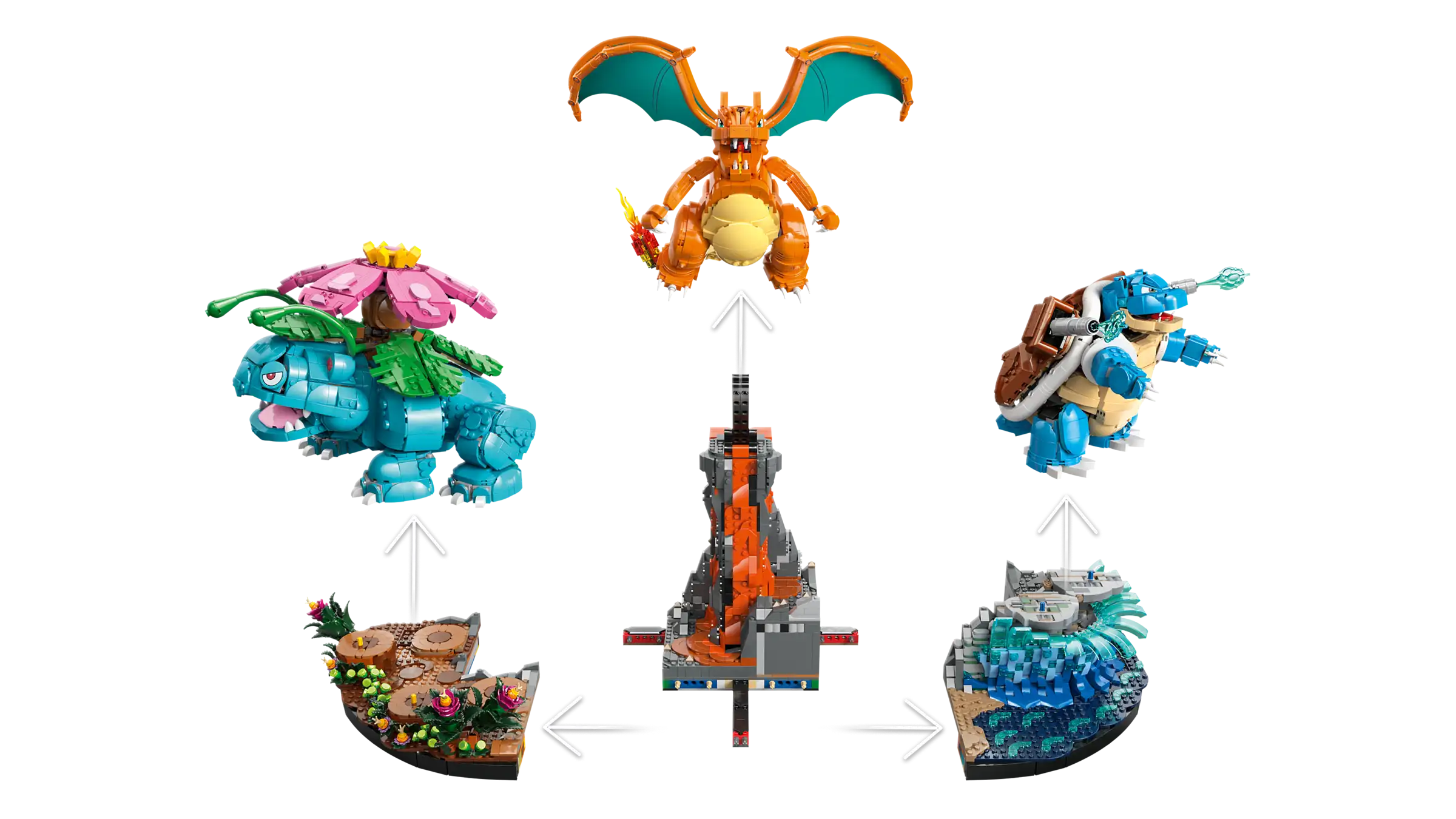 Le set LEGO® Pokémon™ Florizarre, Dracaufeu et Tortank réunit trois des Pokémon les plus iconiques. Avec ses 6 838 pièces, il fait partie des plus grands sets à exposer chez soi. Il met en scène, pour la toute première fois en version LEGO, les trois évolutions des Pokémon de départ de la région de Kanto.