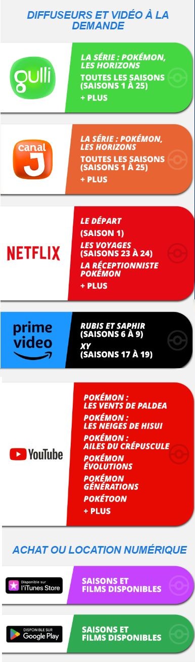 Pour retrouver légalement toutes les saisons de la Pokémon, la série animée, The Pokémon Company nous oriente gentiment vers YouTube, le replay des chaînes de télé Gulli et Canal J et les services de vidéo par abonnement, Netflix et Prime Vidéo (voir ici).
