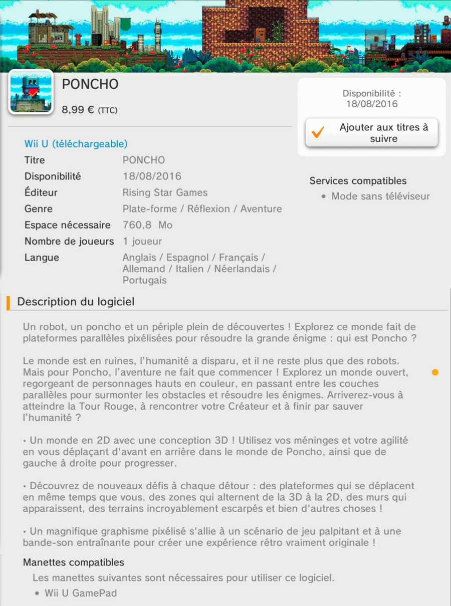 Poncho est disponible à partir du 18 août sur l'eShop de la Wii U au prix de 8,99€. Retrouvez des images, la fiche eShop et le trailer du jeu ci-dessous.