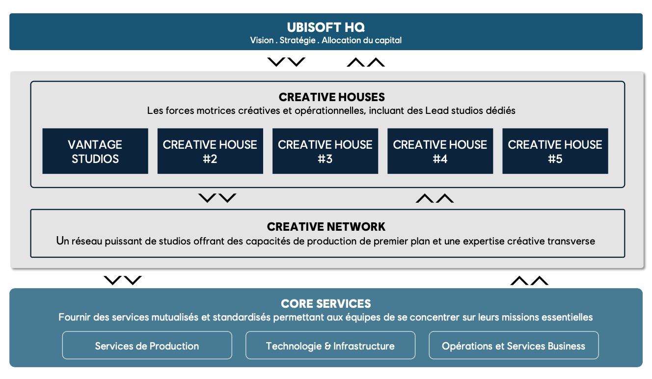 Le nouveau modèle opérationnel d’Ubisoft sera structuré autour de cinq Creative Houses, soutenues par un Creative Network, une plateforme d’expertise partagée fournissant des ressources de développement, par des équipes de Core Services mutualisés, ainsi que par un siège repensé. Cette nouvelle organisation entrera en fonctionnement début avril.