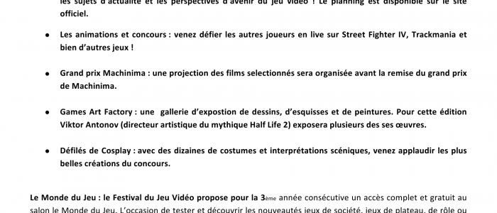 Le Festival du Jeu Vidéo ouvre ses portes dans deux petits jours et c'est l'occasion pour nous de vous dévoiler en exclusivité (nous avons le communiqué officiel en avance !) le contenu de celui-ci. Sachez que ce salon ne sera pas comme les années précédentes et s'orientera plus vers l'industrie du jeu vdéo. Pour preuve, nous venons d'être informés par les organisateurs que Nintendo ne sera pas présent (tout comme Ubisoft et la plupart des gros éditeurs). Conférences et découvertes sont les mots de cette année !