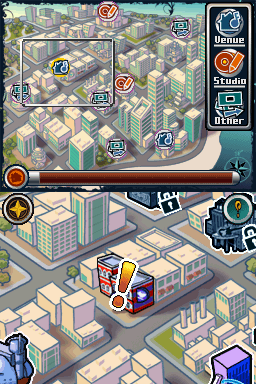 Le menu principal est en fait votre ville, Rockopolis, dans laquelle vous choisissez votre destination. Un petit entrainement au studio de répèt, ou un concert dans le café du coin ? (il faut bien commencer sa carrière quelque part !)