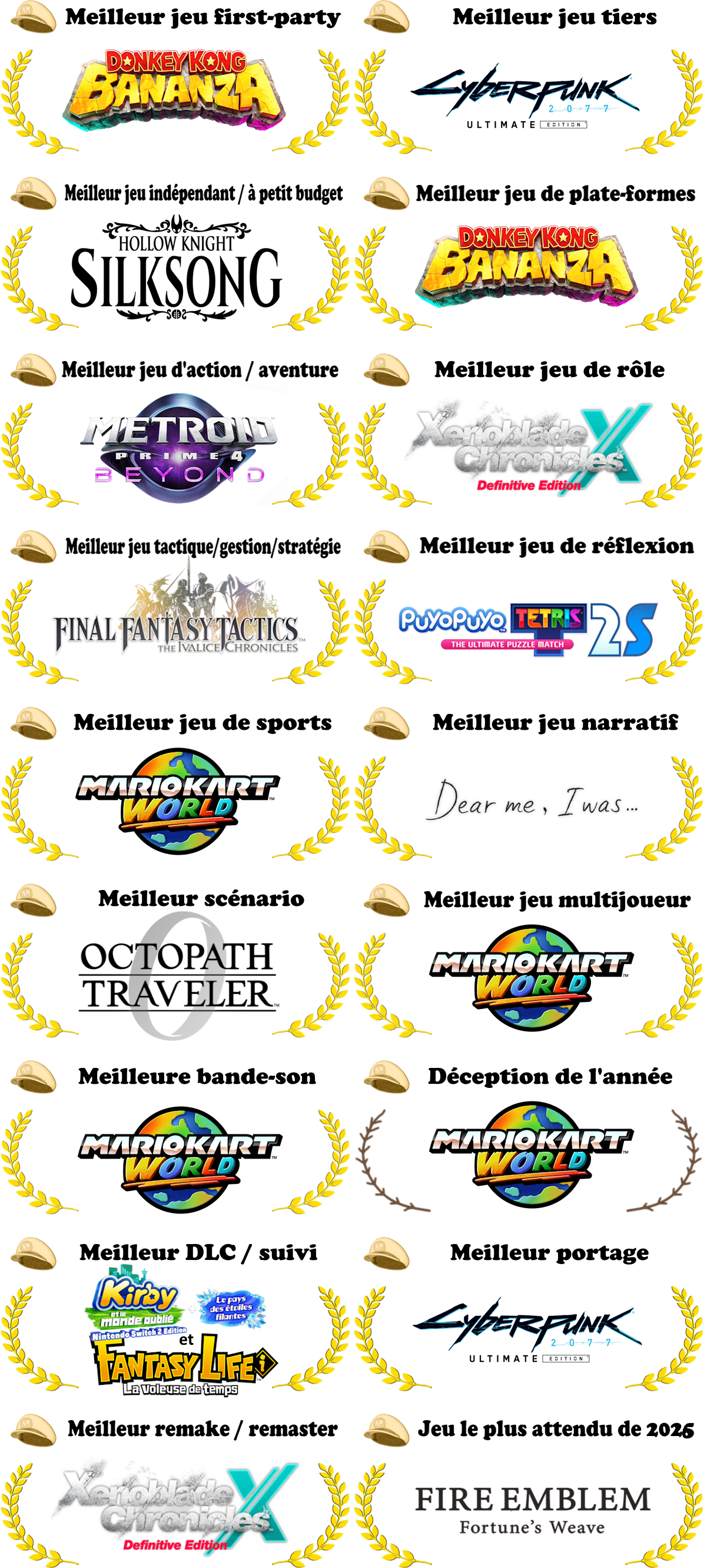 Sans réelle surprise, les plus grosses sorties de l'année repartent avec plusieurs prix: Mario Kart World, Donkey Kong Bananza et Xenoblade Chronicles X: Definitive Edition ont raflé la majorité des prix côté Nintendo. Du côté des éditeurs-tiers, c'est Cyberpunk 2077: Ultimate Edition qui se permet de prendre deux prix. Fire Emblem: Fortune's Weave remporte le titre de jeu le plus attendu de 2026 avec une très courte avance: un seul vote le sépare de Resident Evil: Requiem. Notons également une égalité dans la catégorie du meilleur suivi avec Kirby et le Monde Oublié - Nintendo Switch 2 Edition et Fantasy Life i: La Voleuse de Temps qui se partage le trophée. Rarement autant de jeux tiers différents auront été représentés que cette année. Enfin, si Mario Kart World a décroché le plus grand nombre de prix, difficile de rater le moins prestigieux d'entre eux. Malgré ses qualités (dont les musiques, à en croire vos votes), tous les choix effectués par les développeurs ne vous ont pas convaincus.