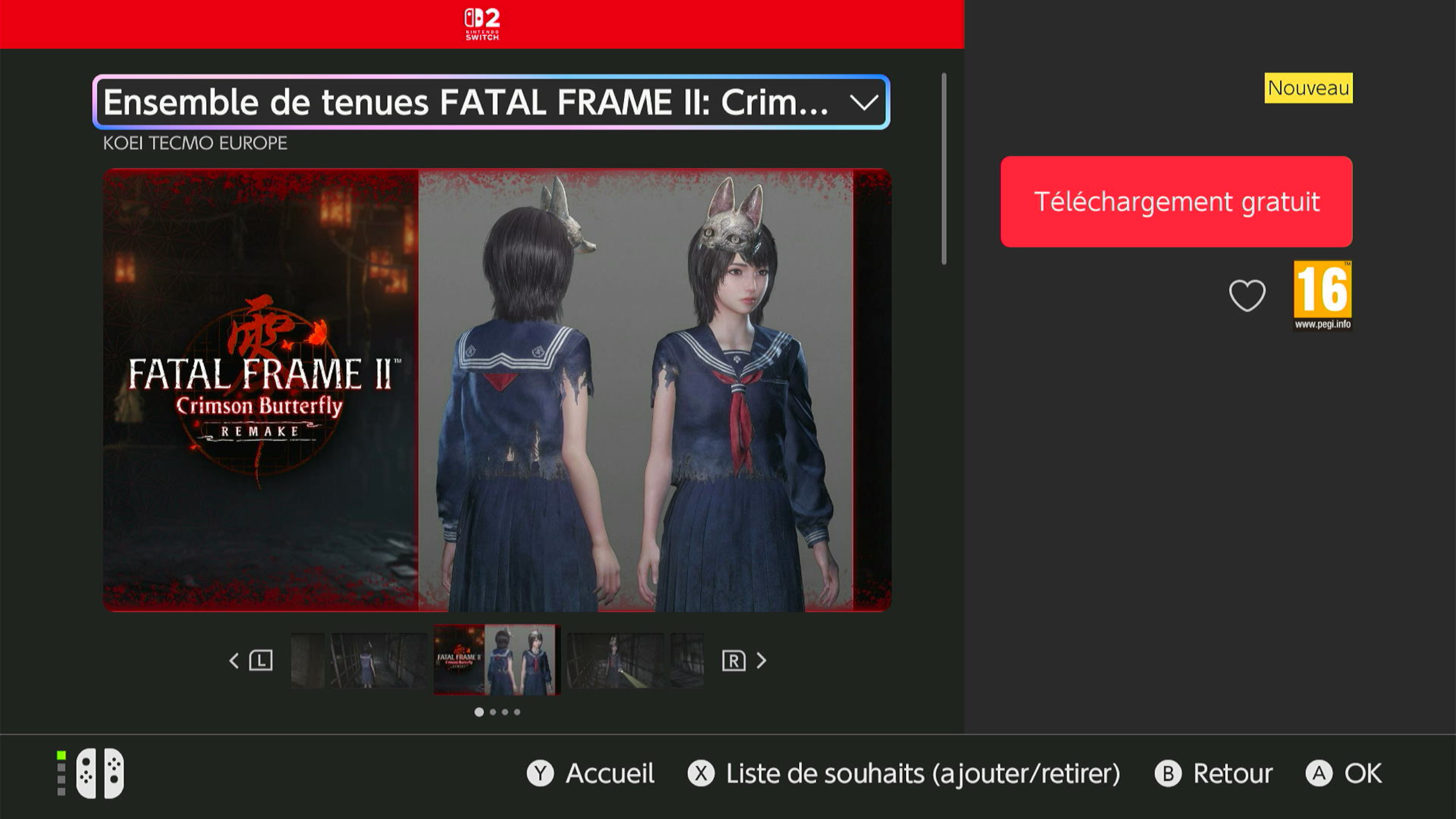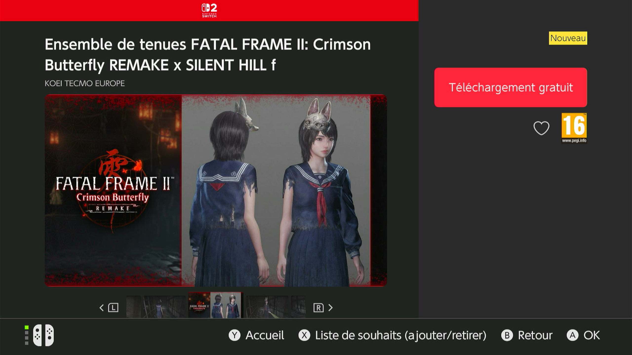 Pour rappel, FATAL FRAME II: Crimson Butterfly REMAKE est disponible depuis le 12 mars 2026 sur Nintendo Switch 2 mais aussi sur PC, PS5 et Xbox Series.. Pour en savoir plus, retrouvez notre test complet sur Switch 2 et sinon vous pouvez commencer à jouer grâce à une démo gratuite- voir ICI.